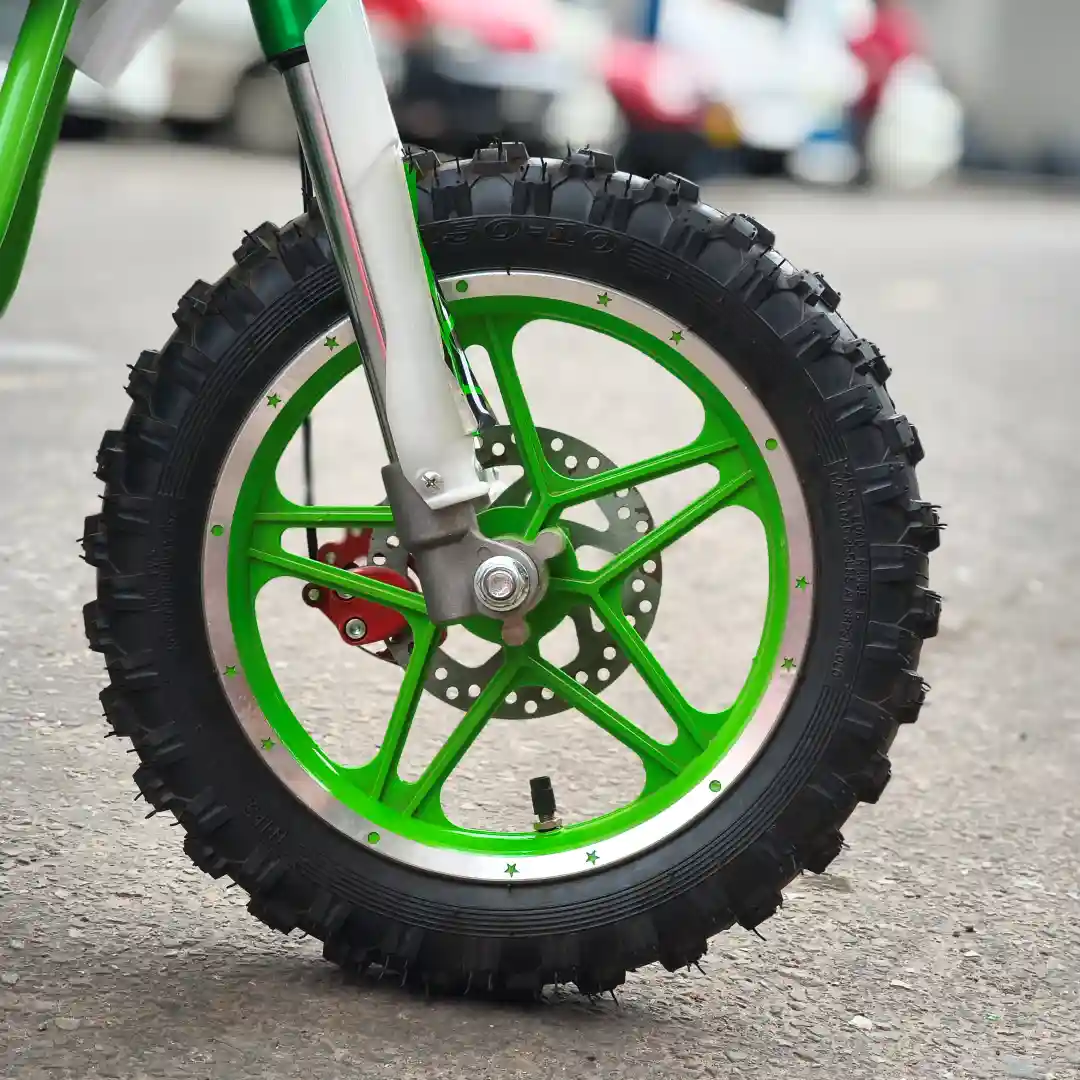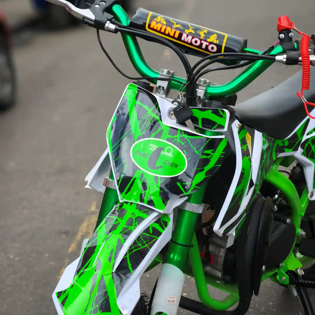 Construida para la Aventura: Cada componente de la ZC-YZ102F ha sido pensado para la durabilidad y el rendimiento off-road. Las horquillas delanteras, con su combinación de verde vibrante y blanco limpio, no solo lucen geniales sino que están diseñadas para absorber los impactos y proporcionar una conducción suave. El manillar ancho, con puños texturizados para un agarre firme, y la barra acolchada con el logo «MINI MOTO», ofrecen un control excelente y comodidad.
