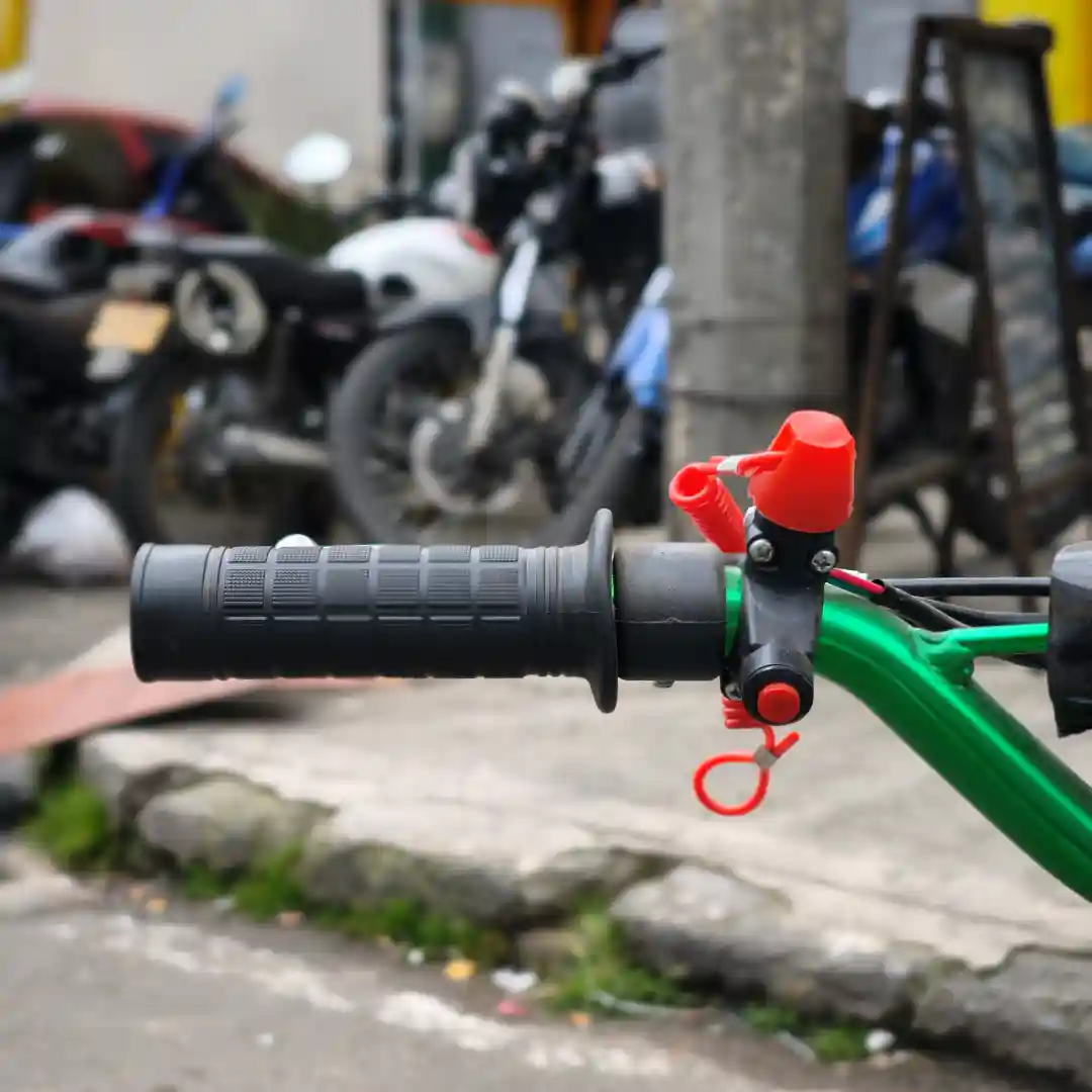 Cable de seguridad (kill switch): Un elemento de seguridad esencial, de color rojo, que permite apagar la moto rápidamente en caso de emergencia, conectado a la muñeca del piloto.