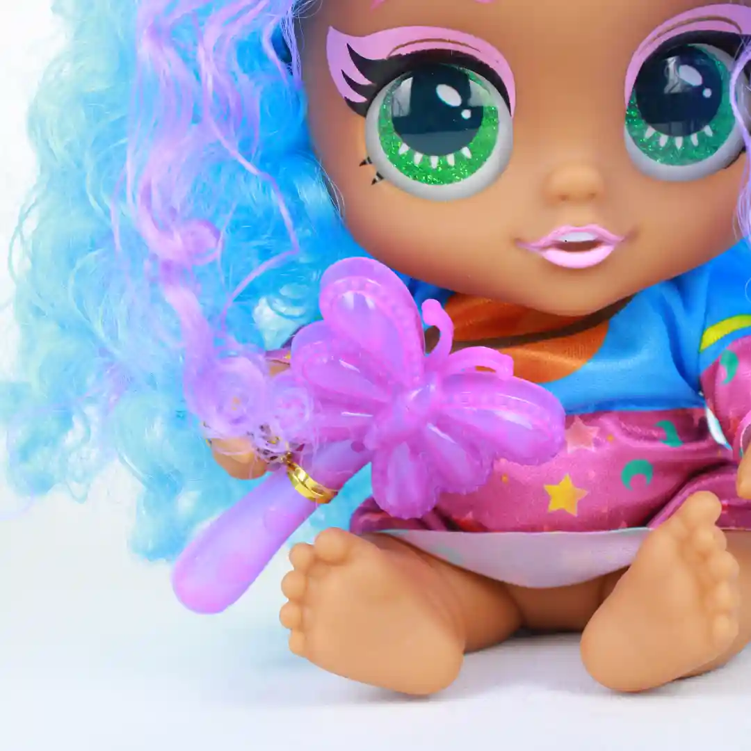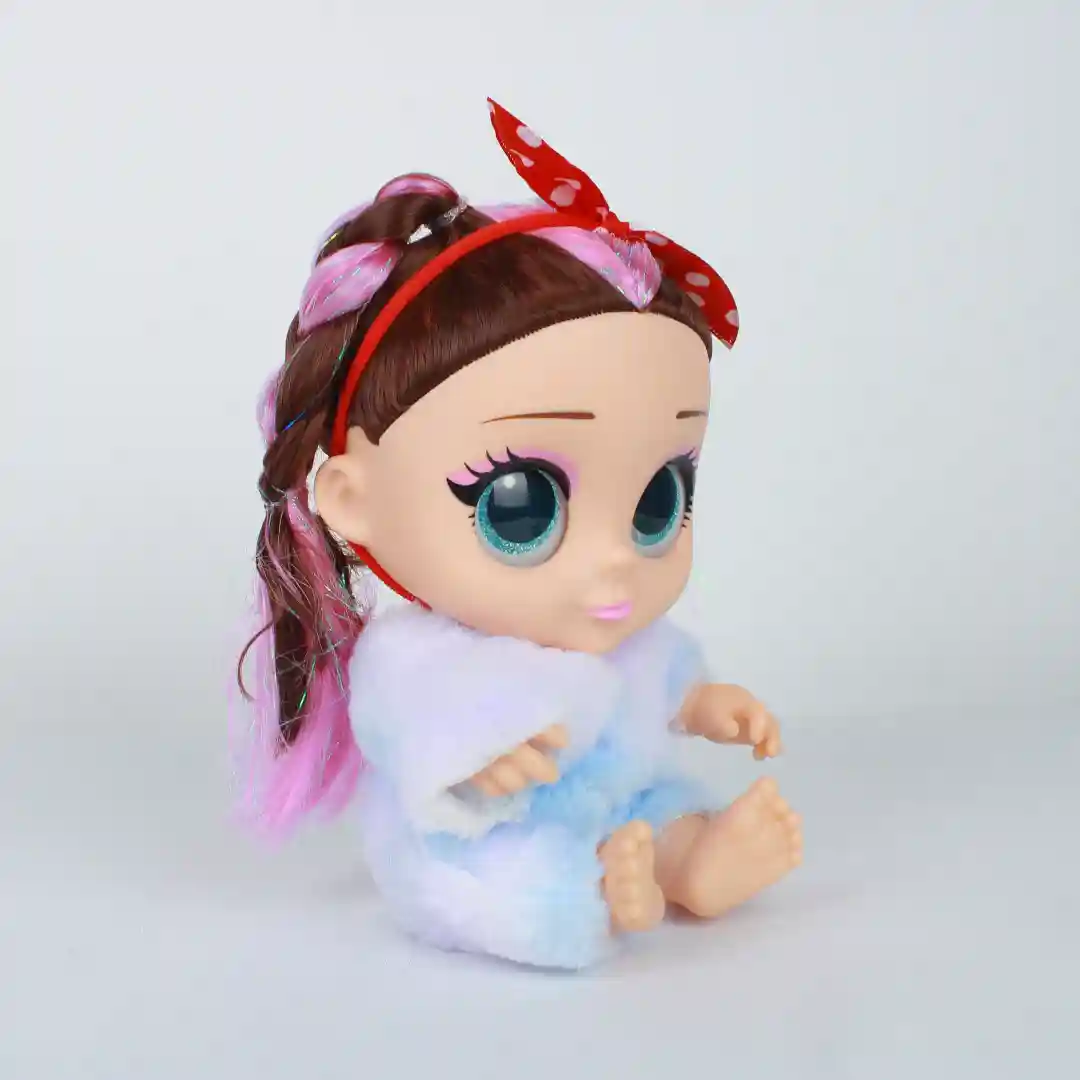 • Diseño: cabello trenzado con detalles de colores, ojos grandes y expresivos, ropa de felpa con detalles en colores pastel.