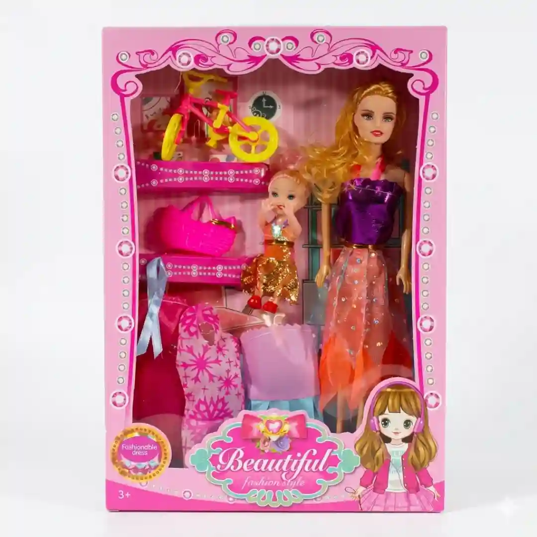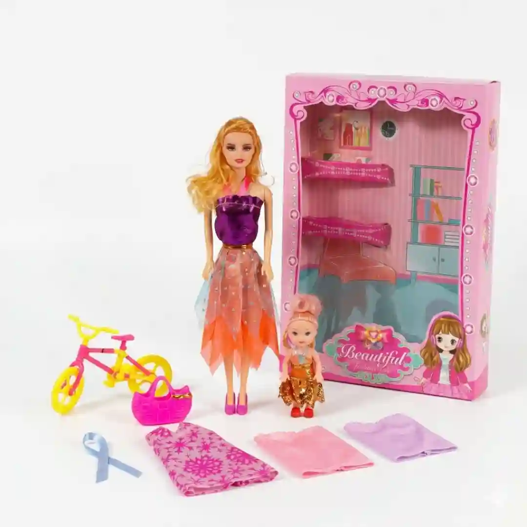 • Incluye: Muñeca grande, muñeca pequeña, vestidos, accesorios y bicicleta