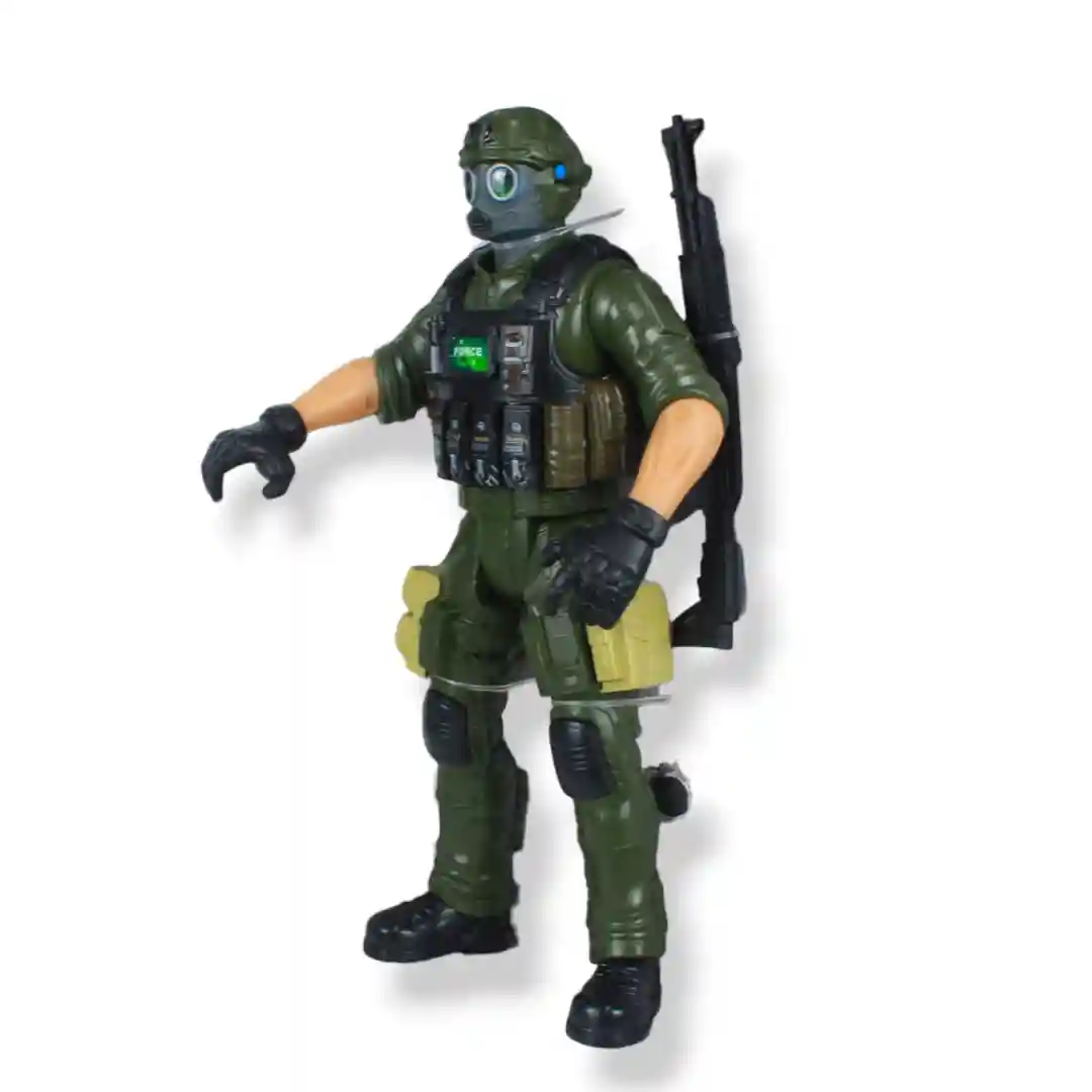 Diseño: Figura de soldado articulada con vestimenta de combate, incluyendo casco y chaleco táctico.