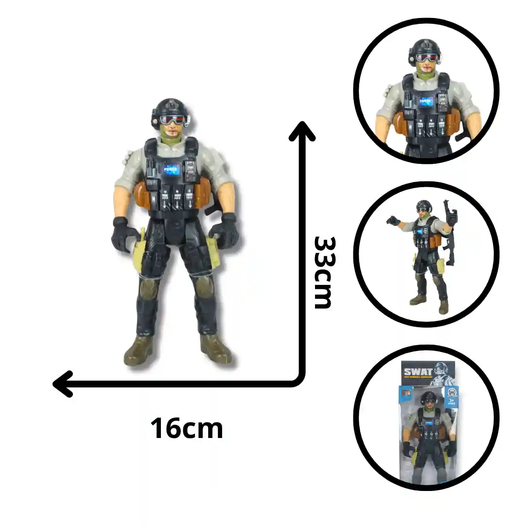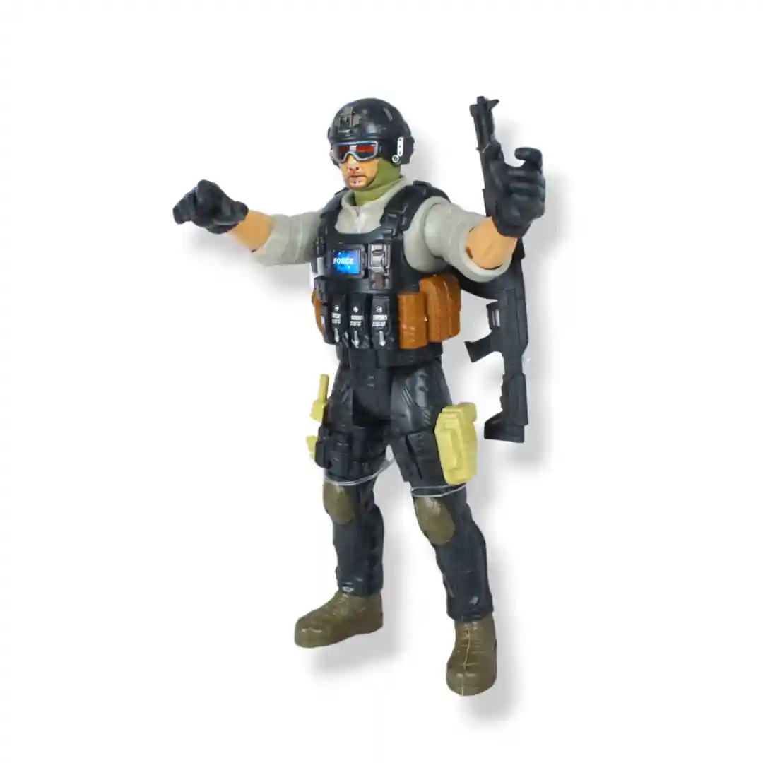 Contenido del Paquete: 1 muñeco soldado SWAT, 1 fusil de asalto.