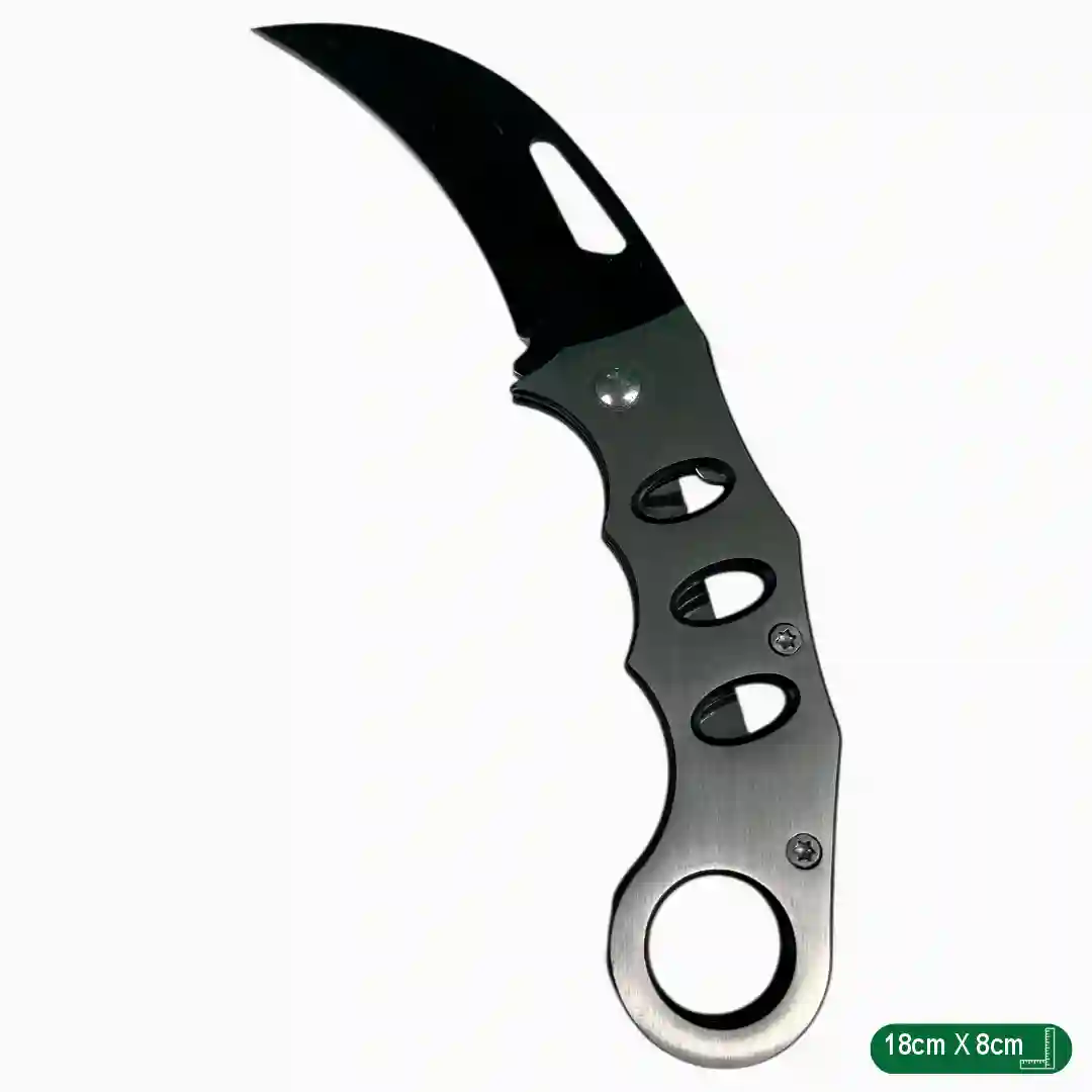 Características Hoja de acero con recubrimiento en color negro de alta resistencia. Apertura manual facilitada por un orificio ergonómico en la hoja. Empuñadura metálica con acabado plateado cepillado. Diseño con perforaciones funcionales para un agarre más seguro. Sistema de plegado fluido con tornillería de seguridad. Perfil aerodinámico que facilita su almacenamiento y transporte.