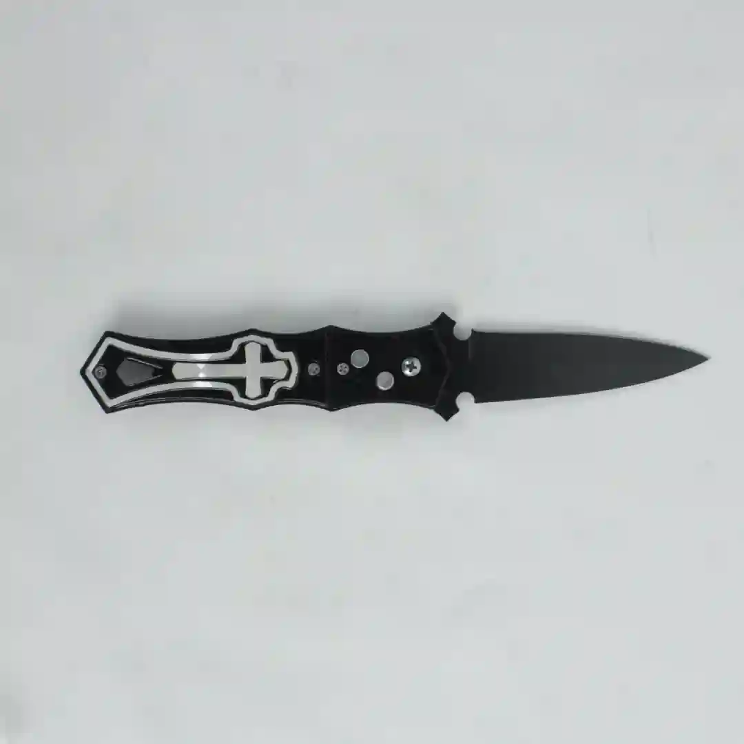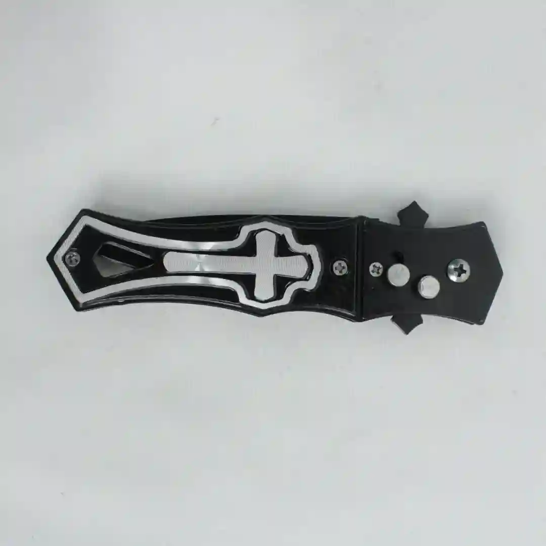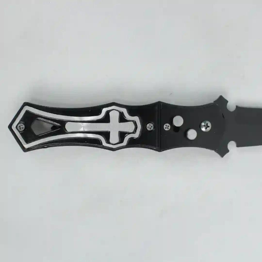 Herramienta de apertura automática con diseño táctico y estilizado, destacada por un distintivo relieve decorativo de cruz en su empuñadura. Su estructura robusta y acabado en color negro mate proporcionan una estética sobria y profesional, ideal para coleccionistas o uso funcional en diversas actividades.