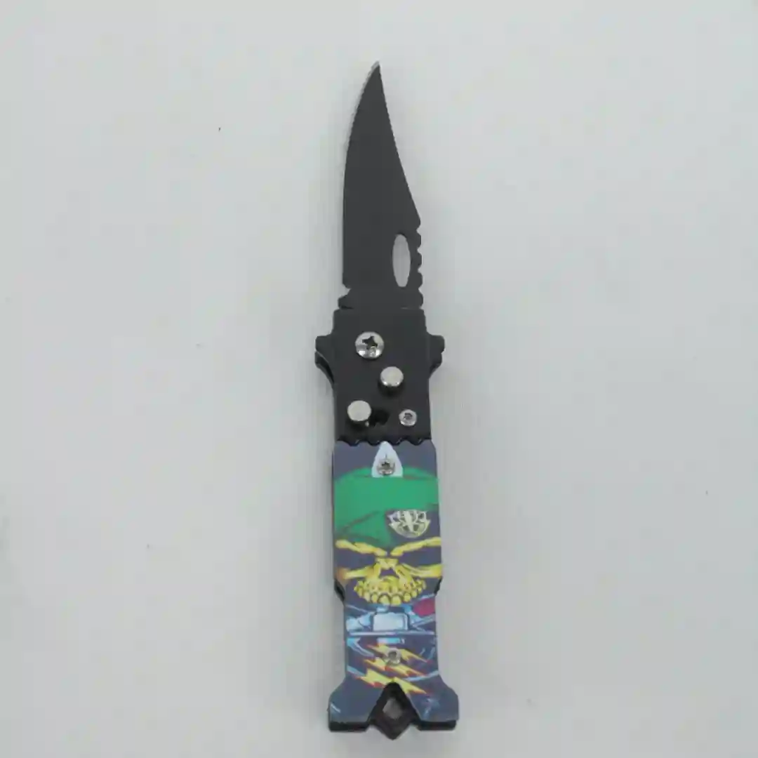 Navaja táctica de apertura automática perteneciente a la serie de supervivencia, diseñada con un acabado estético de alta calidad mediante patrones estampados. Su estructura robusta y su mecanismo de despliegue rápido la convierten en una herramienta confiable y funcional para actividades al aire libre, tácticas y defensa personal, proporcionando un agarre seguro gracias a su diseño ergonómico.