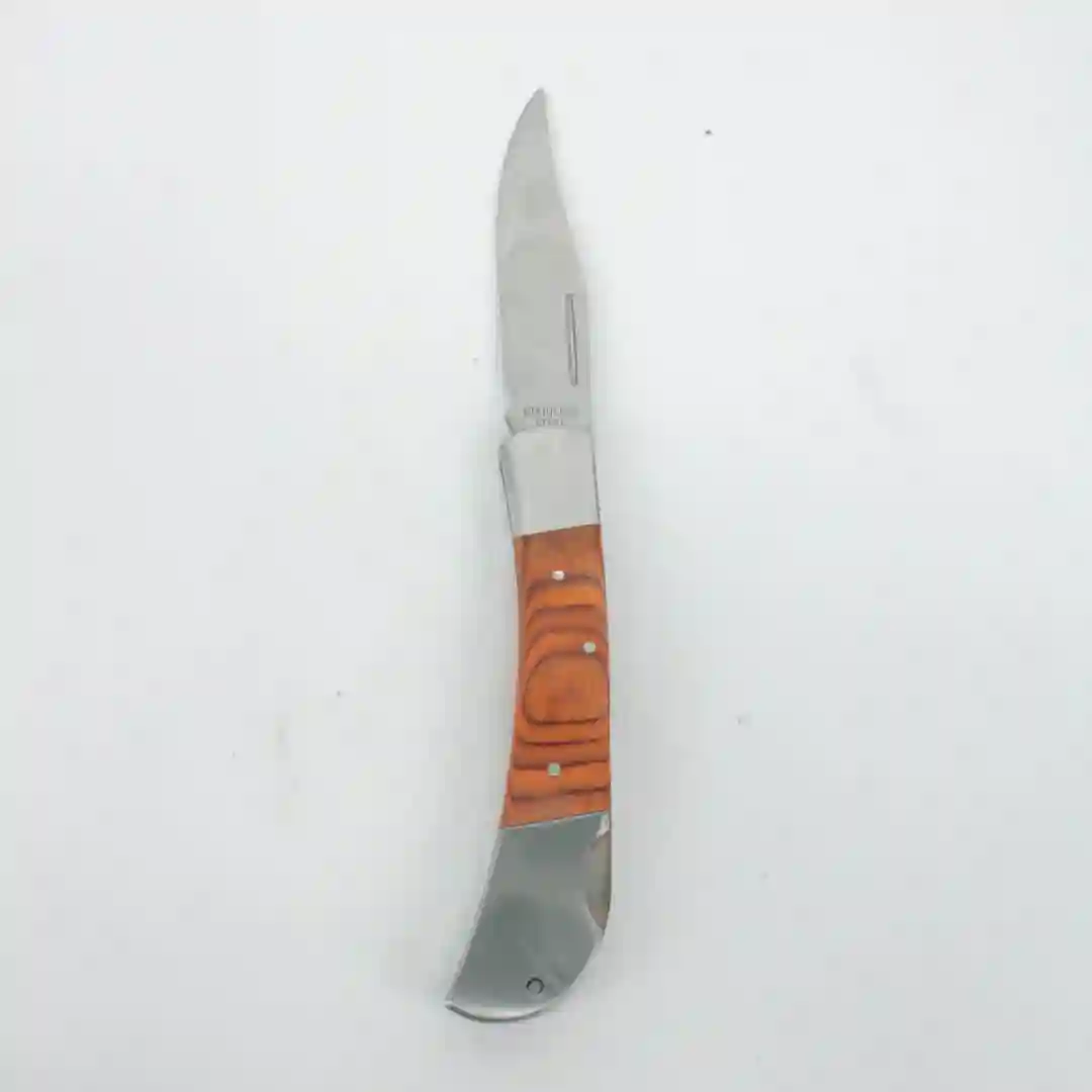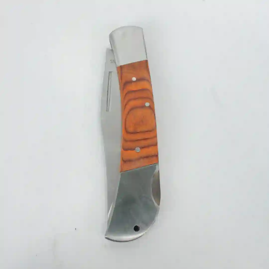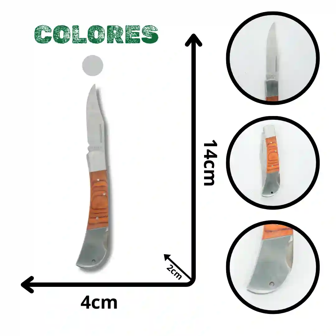 Navaja plegable de diseño táctico y deportivo con mango ergonómico texturizado para un agarre firme. Presenta una hoja de acero con acabado oscuro y detalles de diseño funcionales tanto en la estructura como en su empaque decorativo.