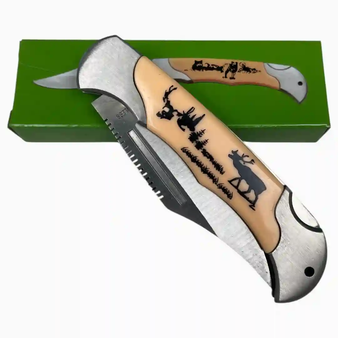 Navaja plegable de bolsillo con un diseño artístico y contemporáneo, caracterizada por su acabado integral en color negro mate. El mango presenta un grabado detallado con figuras de aves y motivos florales en contraste blanco, ofreciendo una estética elegante y distintiva. Es una herramienta compacta, diseñada para combinar un estilo visual atractivo con una funcionalidad práctica para el uso diario.