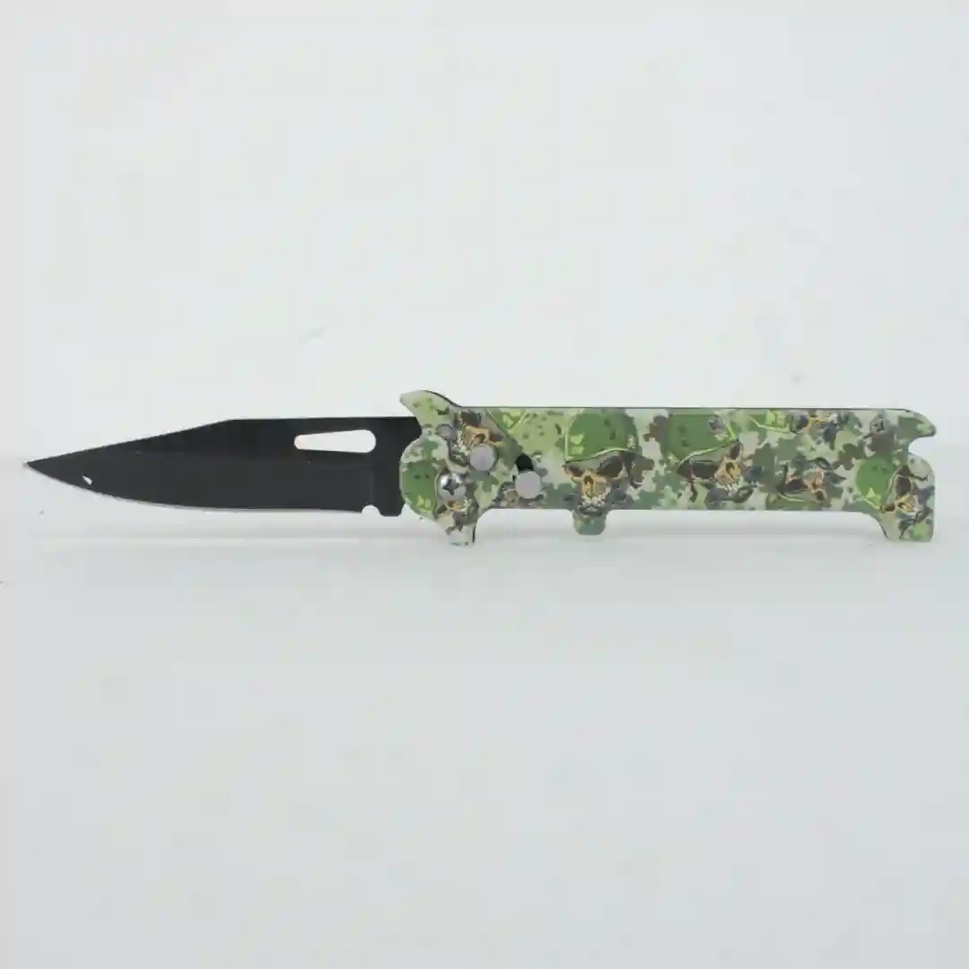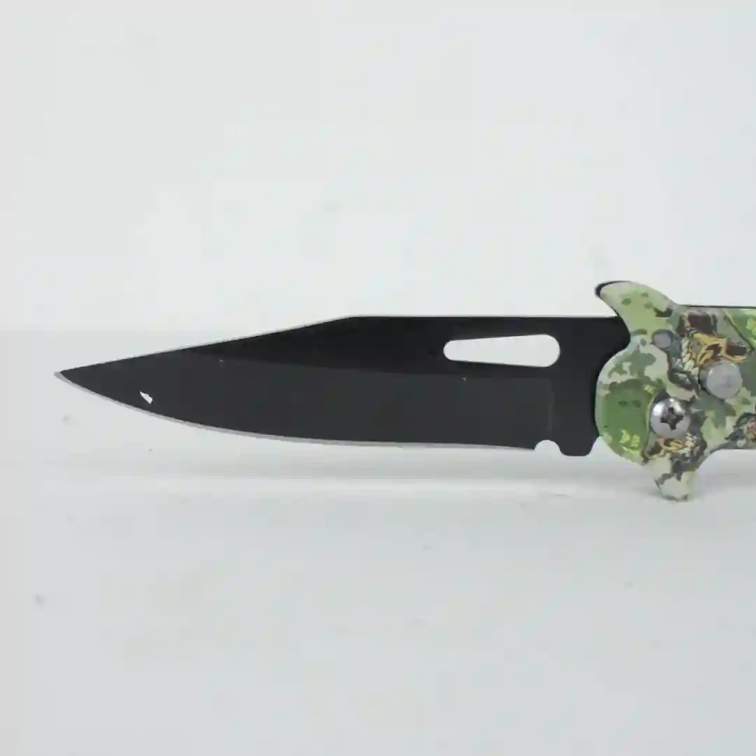 Navaja plegable de alto rendimiento con diseño ergonómico, fabricada para ofrecer durabilidad y precisión en diversas condiciones. Su estructura integra un mango de polímero negro con texturas de alta tracción y una hoja de acero con acabado oscuro para reducir el reflejo, ideal para uso táctico y de supervivencia.
