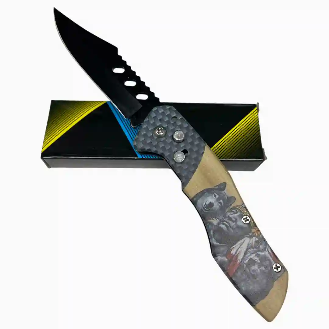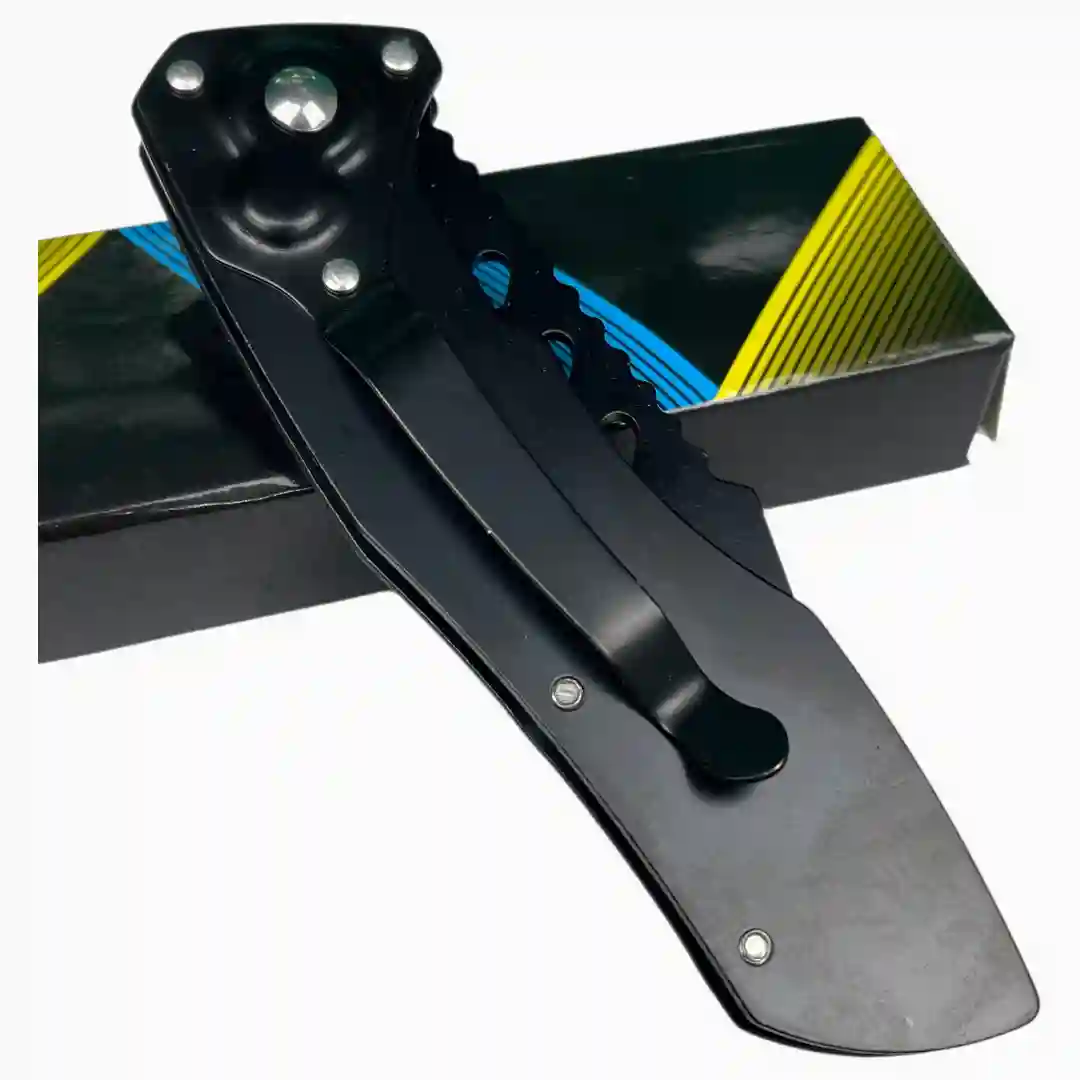 Navaja plegable de bolsillo con un diseño táctico minimalista en acabado negro mate integral. Este modelo destaca por su estructura ligera y perfil ultra delgado, facilitando un transporte discreto y cómodo. Su mango metálico cuenta con un patrón de perforaciones circulares que no solo aportan una estética moderna, sino que también optimizan el equilibrio y reducen el peso total de la herramienta.