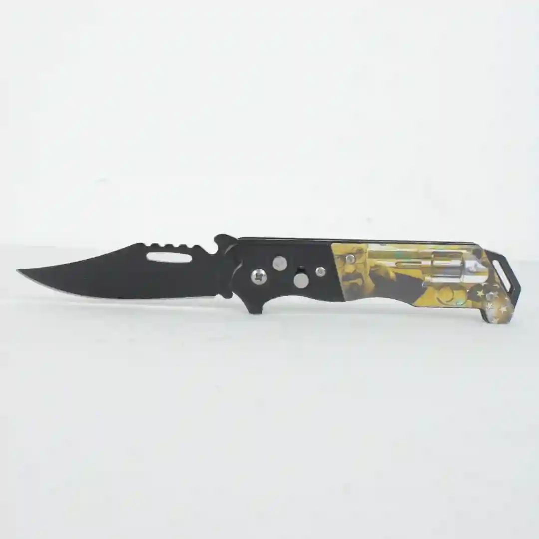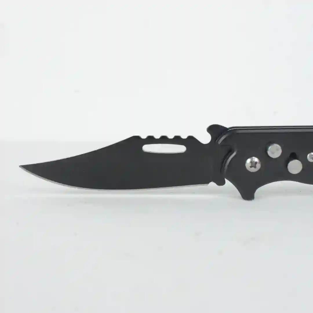 Navaja plegable de diseño táctico y deportivo, construida para ofrecer resistencia y funcionalidad en actividades de supervivencia y uso diario. Cuenta con un mango ergonómico texturizado que asegura un agarre firme y una hoja con acabado oscuro que reduce los reflejos.