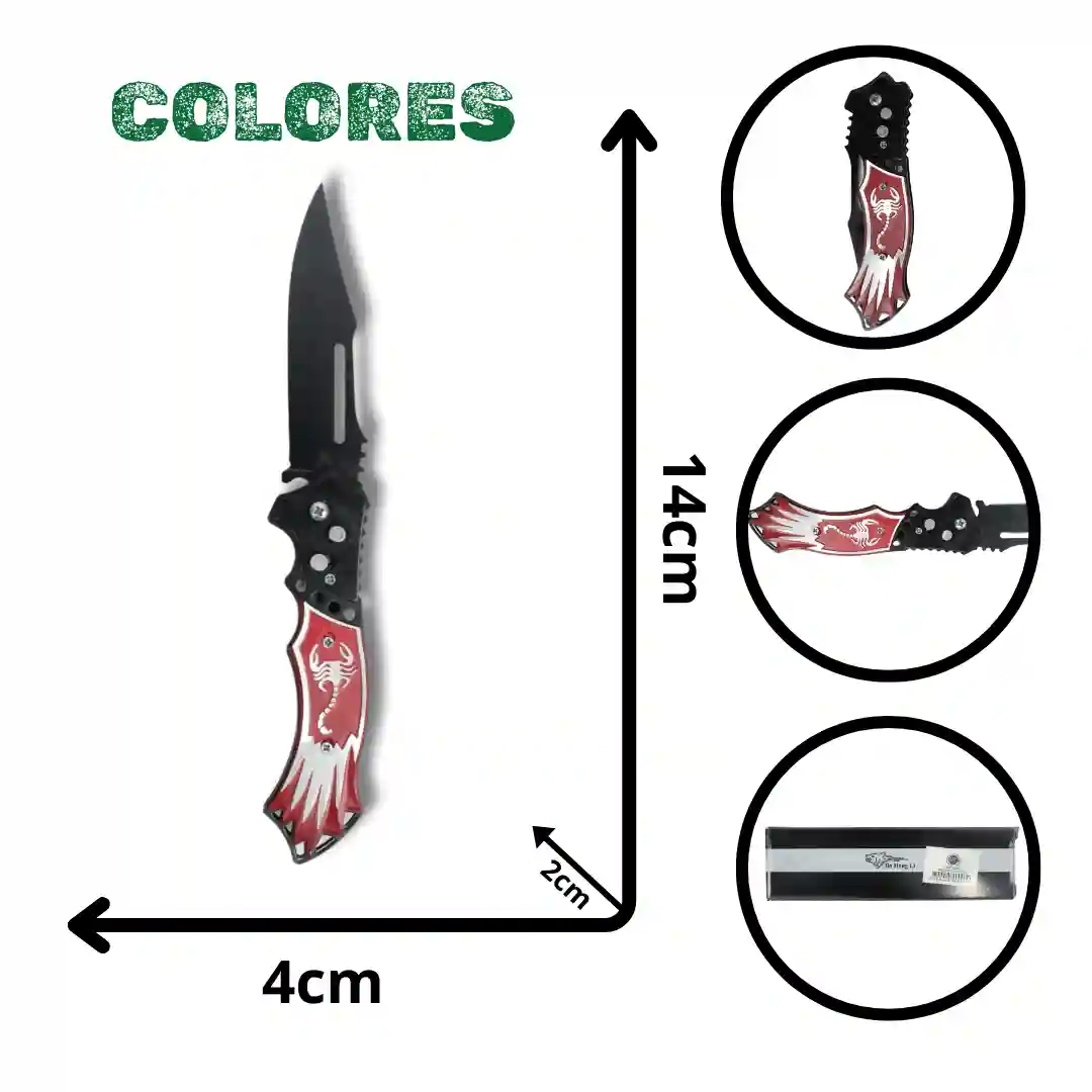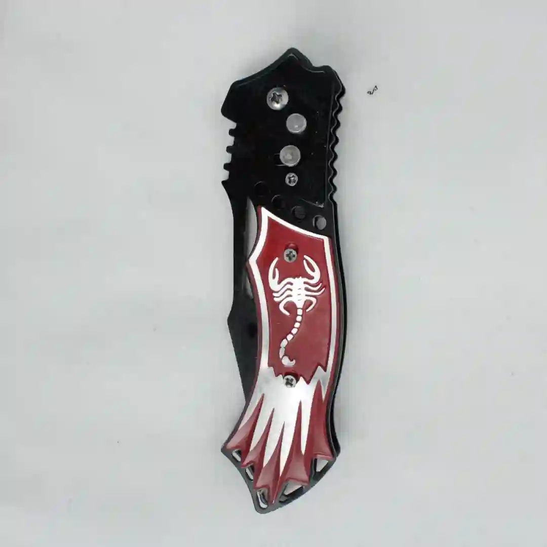 Herramienta de corte de alto rendimiento con un diseño agresivo y estilizado, ideal para quienes buscan funcionalidad y estética en un solo producto. Esta navaja destaca por su empuñadura decorativa con un relieve de escorpión y detalles flamígeros que le otorgan un carácter único. Su hoja negra con calados técnicos y sistema de apertura rápida la convierten en un accesorio indispensable para diversas actividades.
