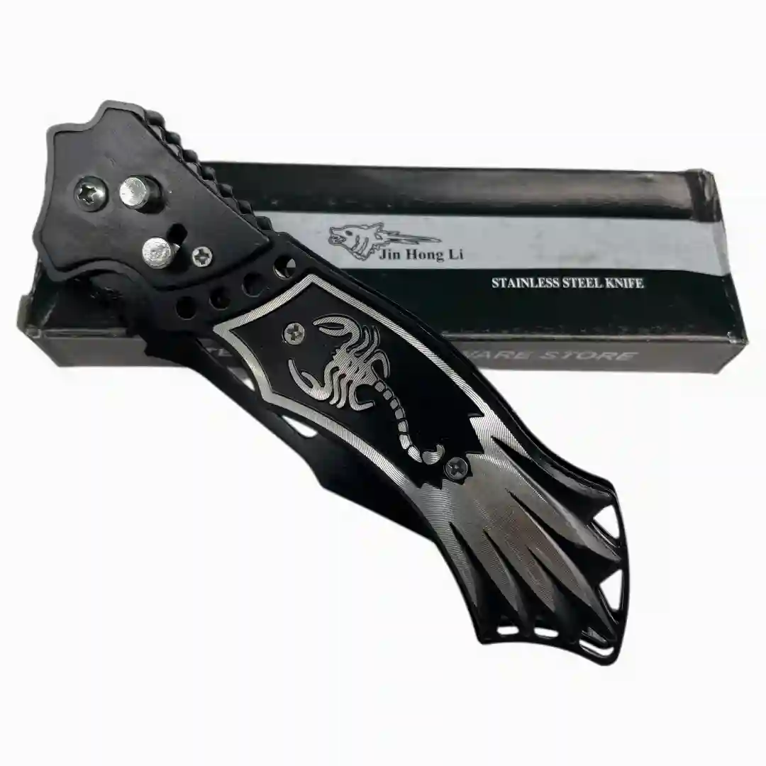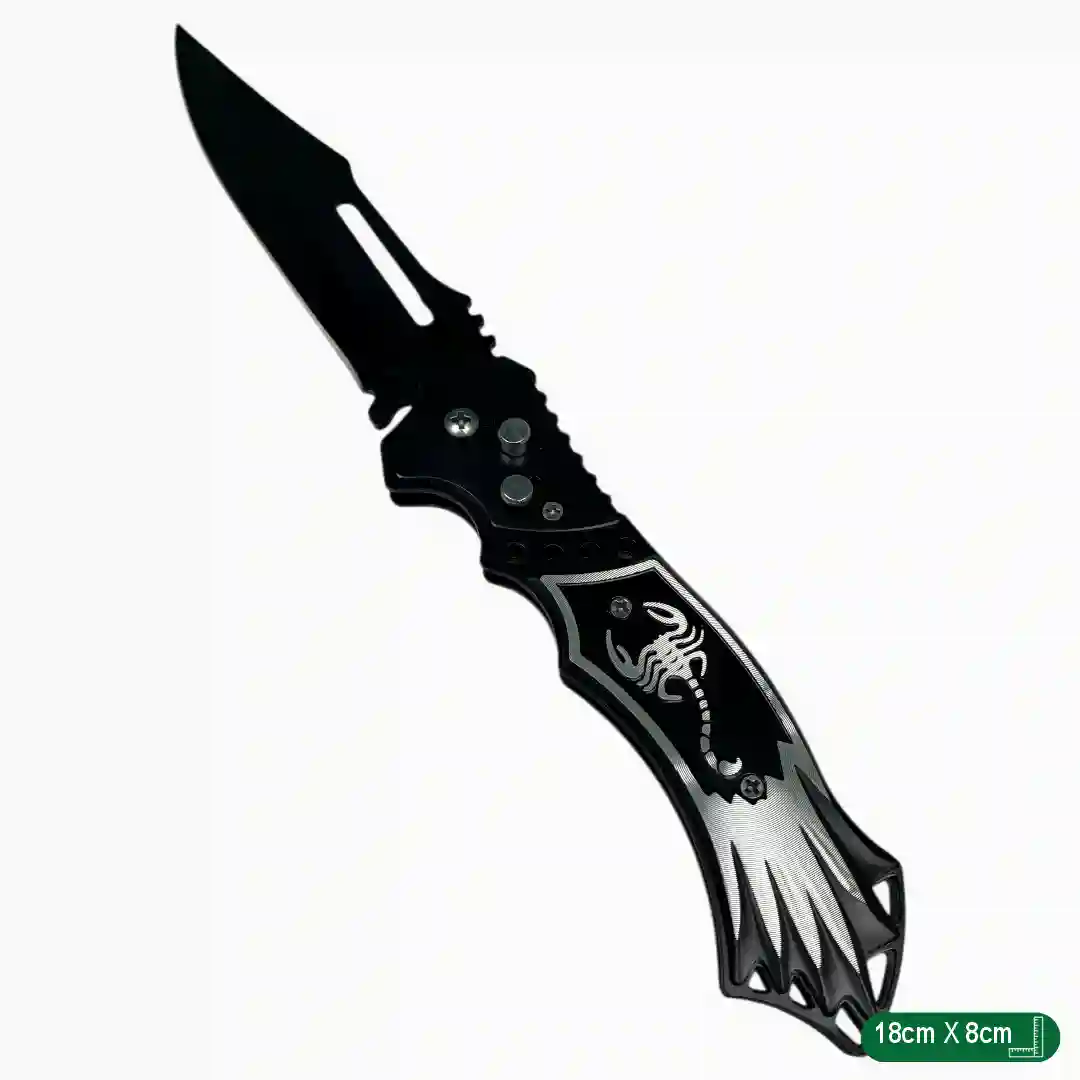 Navaja táctica de alto impacto visual con diseño temático de escorpión. Esta herramienta combina una estética agresiva con una funcionalidad superior, ideal para uso diario o colección. Su estructura integral en color negro mate se complementa con aplicaciones metálicas en el mango que resaltan su ergonomía. Incluye un sistema de apertura rápida y un clip de sujeción para un acceso inmediato y seguro.