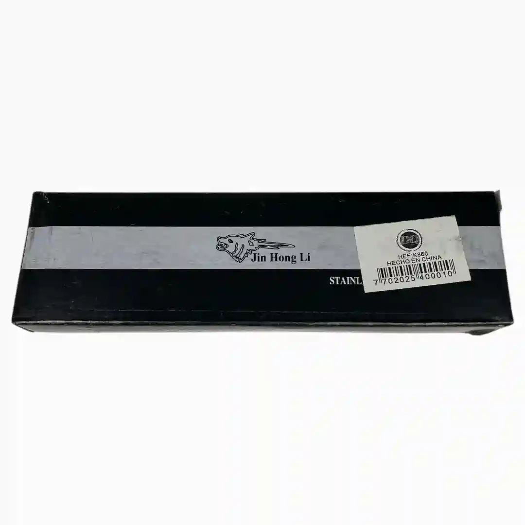 Características Mecanismo de apertura automática accionado por botón pulsador lateral. Sistema de bloqueo de seguridad integrado para evitar cierres accidentales. Hoja de acero inoxidable con recubrimiento negro mate y ranura aerodinámica estilizada. Lomo de la hoja con apoyo dentado para mejorar el control durante el corte. Mango ergonómico con incrustación metálica texturizada y grabado de escorpión. Clip metálico posterior para transporte cómodo en cinturón o bolsillo. Pomo del mango con diseño calado funcional. Presentación en caja original de la marca.