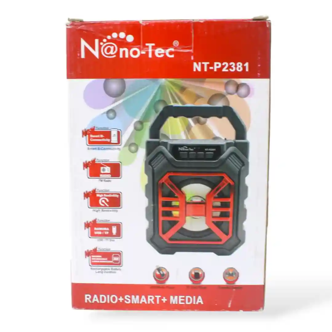 El Parlante Portátil Nanotec NT-P2381 es un dispositivo de audio compacto y potente diseñado para la venta al por mayor. Su diseño robusto en color negro con una llamativa rejilla frontal en rojo y luces LED lo hace visualmente atractivo para el mercado de consumo. Este parlante no solo ofrece conectividad Bluetooth inteligente, sino que también integra funciones de radio FM y la capacidad de reproducir música desde memorias USB y tarjetas TF, lo que lo convierte en un producto multifuncional con un amplio público objetivo.