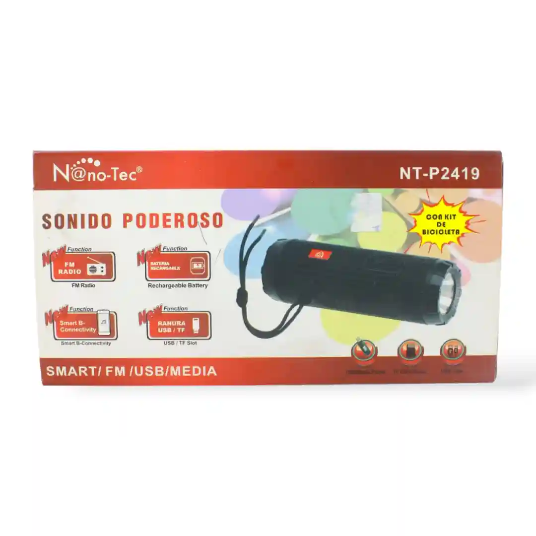 El Parlante Multifuncional Nanotec NT-P2419 es un producto diseñado para revendedores que buscan ofrecer una solución de audio versátil y robusta. Este dispositivo combina un potente parlante, una linterna de alta intensidad y la capacidad de reproducir música desde diversas fuentes. Su diseño cilíndrico y su acabado en material resistente lo hacen ideal para actividades al aire libre. La inclusión de un kit de montaje para bicicleta amplía su mercado, posicionándolo como un accesorio perfecto para ciclistas y aventureros.