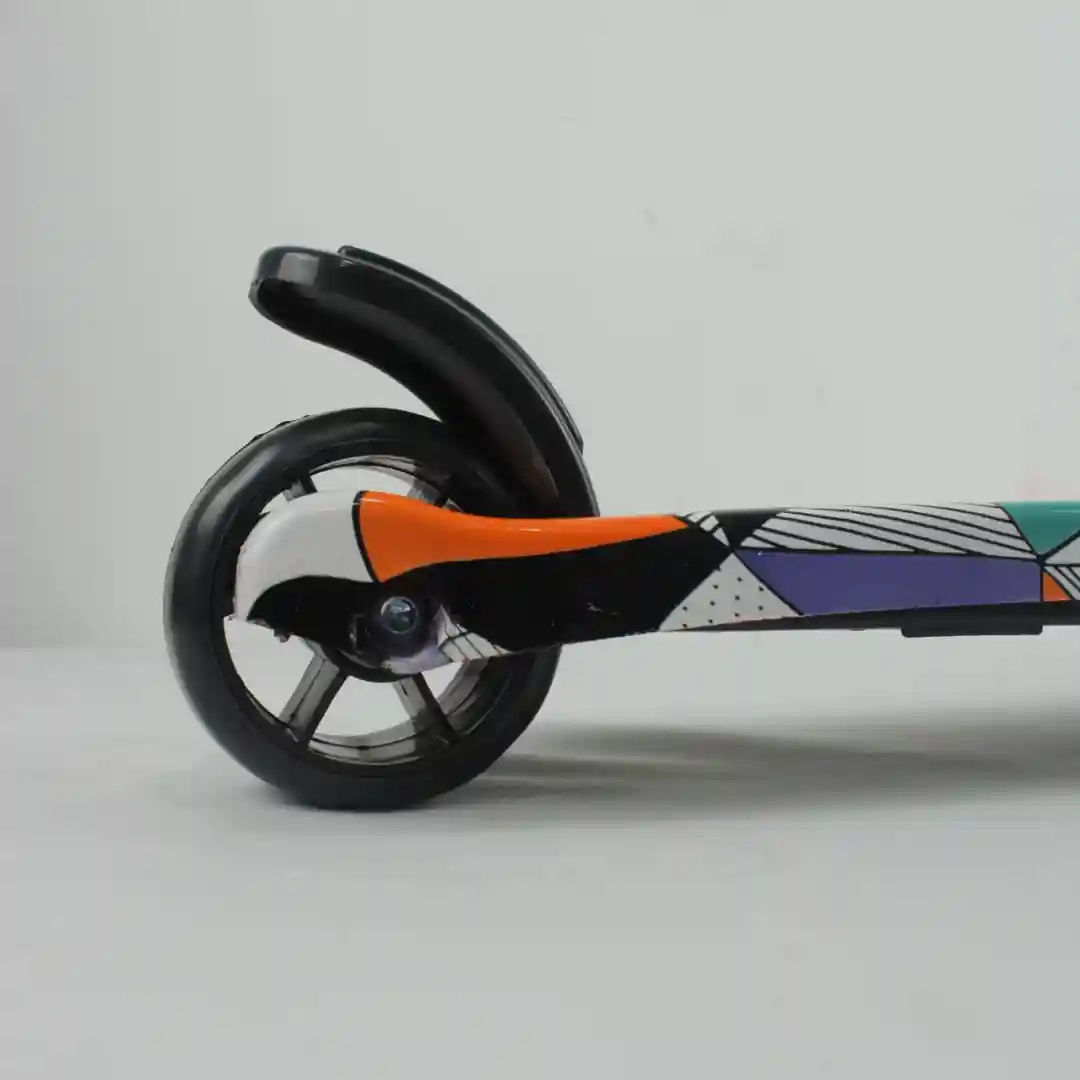 Lo primero que salta a la vista es su diseño aerografiado. Los colores vibrantes y los gráficos impresos a lo largo del mástil y el manillar le dan un toque tuning y juvenil muy atractivo. Se aprecian colores como el rojo, azul y negro, con figuras que la hacen lucir rápida y dinámica. Esta estética es un imán para el público infantil y adolescente que busca distinguirse.