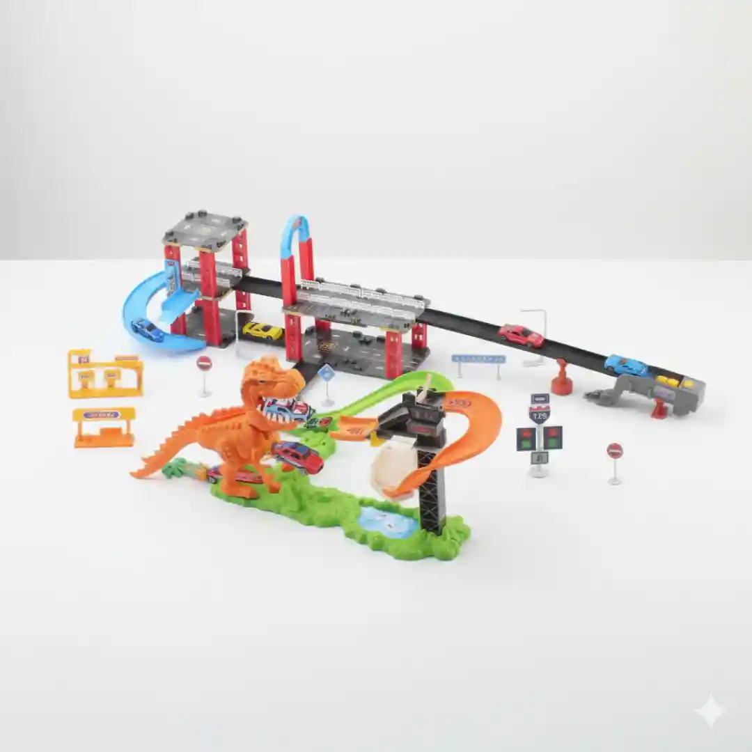 Presentamos la Pista de Carreras de Dinosaurios Grande (Dinosaur Track Set). Este es un set de juego altamente interactivo y de gran formato que combina la popular temática de dinosaurios con la emoción de las pistas de carreras. Es un producto de gran impacto visual que garantiza una excelente rotación y atracción en el punto de venta para minoristas de juguetes.