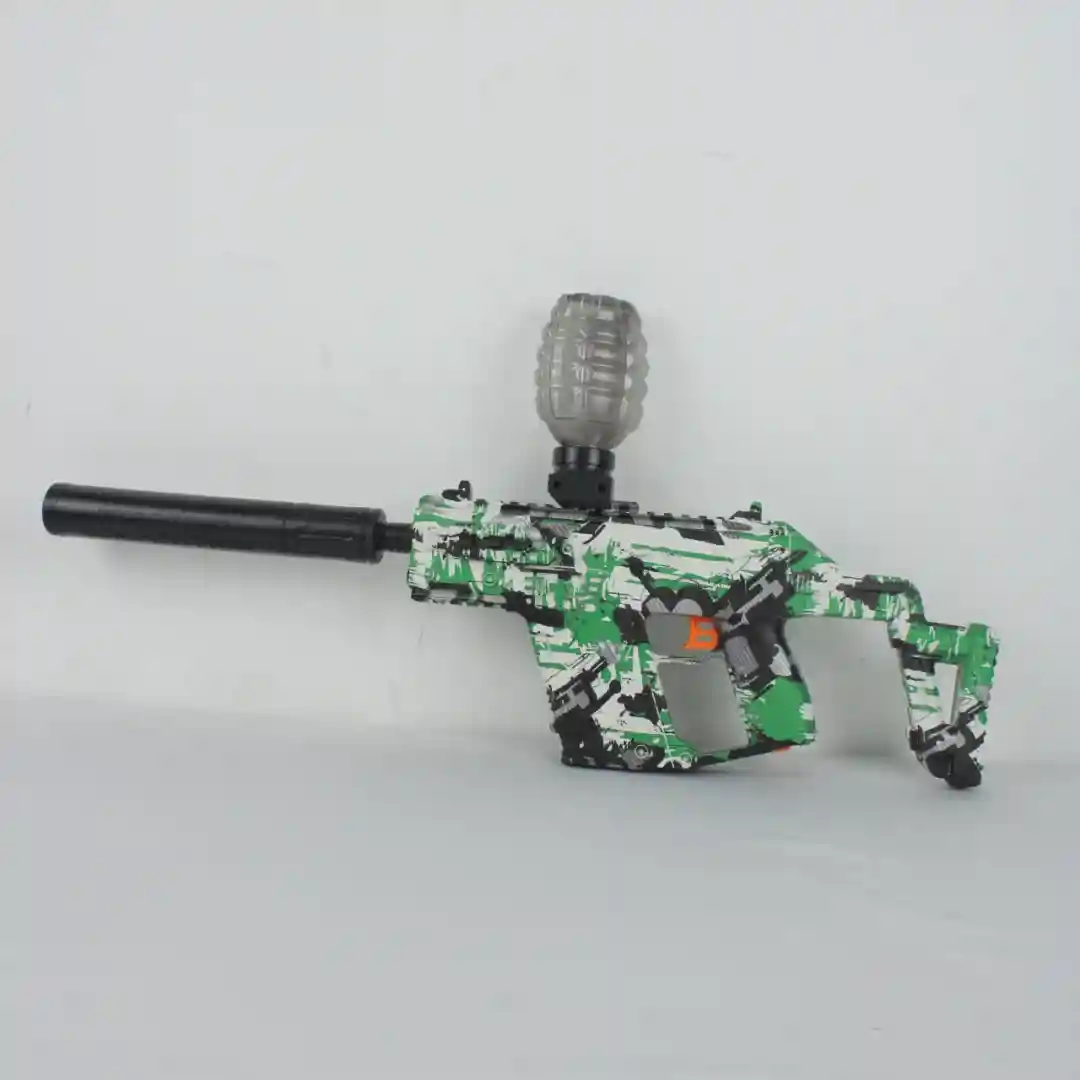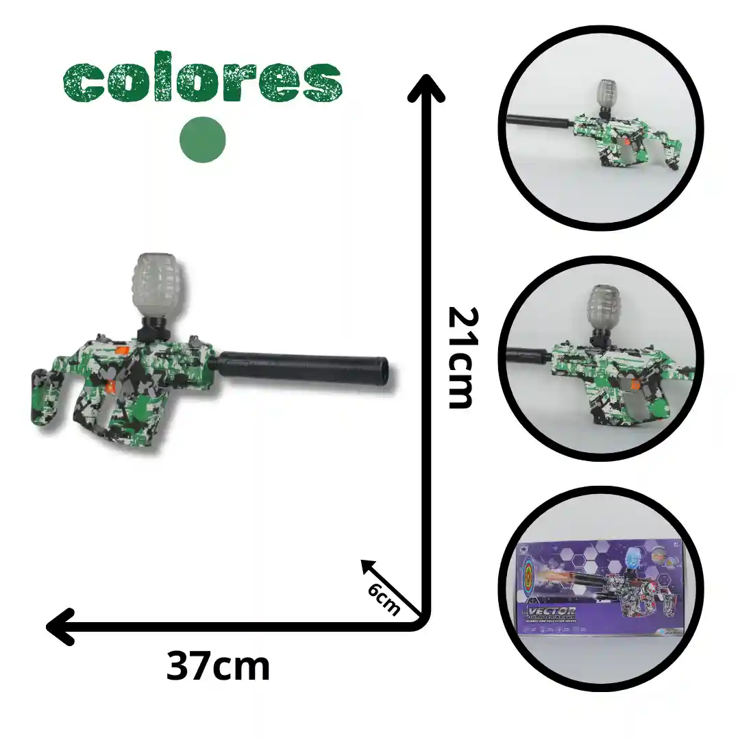 Pistola de hidrogel con batería recargable, balas de hidrogel, cable de carga, accesorios y gafas de protección. Este modelo está fabricado con Plástico ABS de alta resistencia, diseñado para soportar el uso intensivo propio del juego. Su principal característica técnica es el mecanismo de disparo automático accionado por una batería recargable, lo que garantiza una experiencia de juego fluida y continua sin necesidad de recargas manuales constantes.