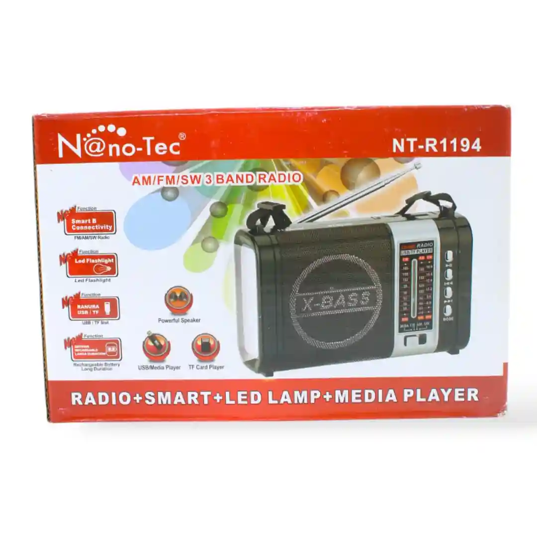 La Radio N@no-Tec NT-R1194 es un producto de alto valor y versatilidad, diseñado para satisfacer las necesidades de un mercado moderno y activo. Su combinación de radio de 3 bandas, conectividad inteligente, reproductor multimedia y una potente linterna LED, la convierten en una solución integral para el entretenimiento y las situaciones de emergencia. Este es un producto ideal para revendedores que buscan ofrecer una herramienta multifuncional y de alta demanda.