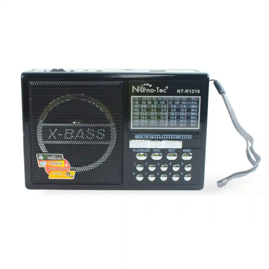 La Radio Nanotec NT-R1216 es un dispositivo de audio portátil que destaca por su combinación de diseño compacto y múltiples funcionalidades. Dirigida a un comprador mayorista, esta radio ofrece una solución de entretenimiento completa. Incorpora sintonización de múltiples bandas (AM/FM/SW1-6), un potente parlante con tecnología X-Bass para graves profundos, y la capacidad de reproducir música desde memorias USB y tarjetas TF. Su conectividad inalámbrica y la batería recargable la hacen ideal para cualquier entorno, desde el hogar hasta actividades al aire libre.