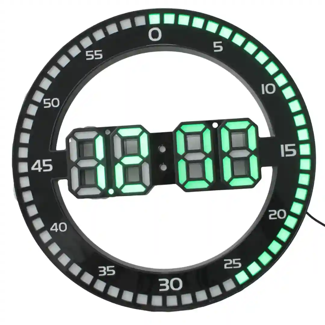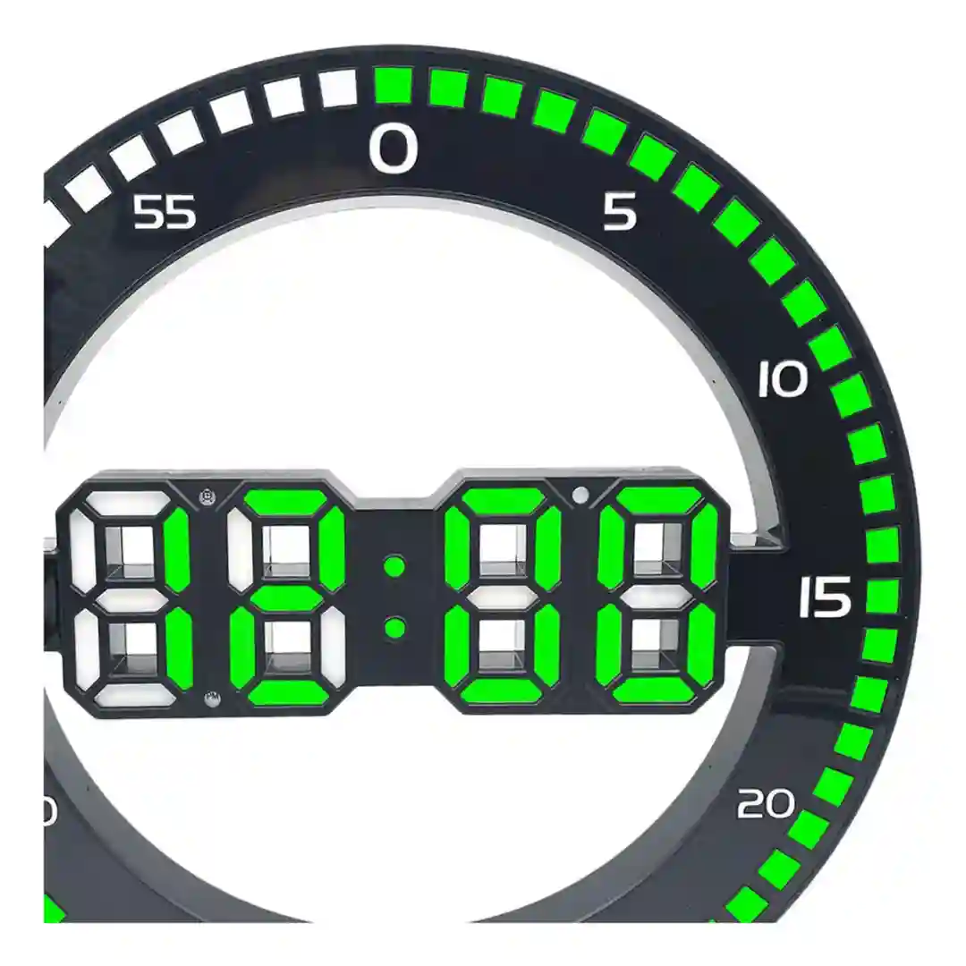 Reloj digital de diseño circular moderno con pantalla LED de alta visibilidad. Este dispositivo integra una estética vanguardista con funciones tecnológicas avanzadas, ideal para espacios interiores que requieren un control del tiempo preciso y un toque decorativo contemporáneo. Su estructura resalta los segundos a través de un anillo luminoso perimetral y una visualización central clara.