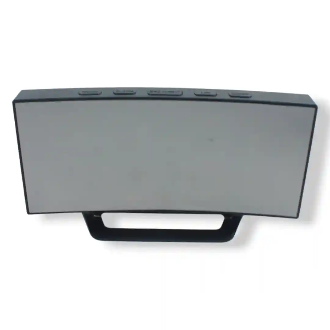 Reloj digital con un diseño moderno y minimalista, que combina una pantalla LED de alta claridad con una superficie de espejo. Su forma curva y su funcionalidad múltiple lo convierten en un accesorio decorativo y práctico para cualquier espacio.