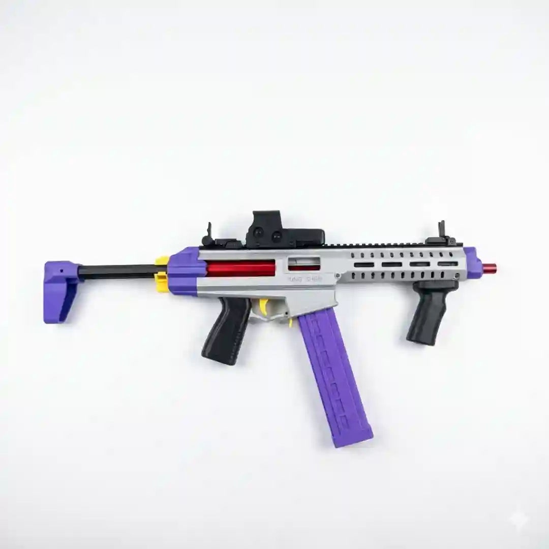 El Rifle XS-909 combina un diseño ergonómico con colores vibrantes y llamativos: tonos morados, grises y detalles en amarillo y rojo que lo hacen destacar en cualquier colección. Su estructura robusta y ligera proporciona un manejo cómodo, ideal para jugadores de todas las edades.