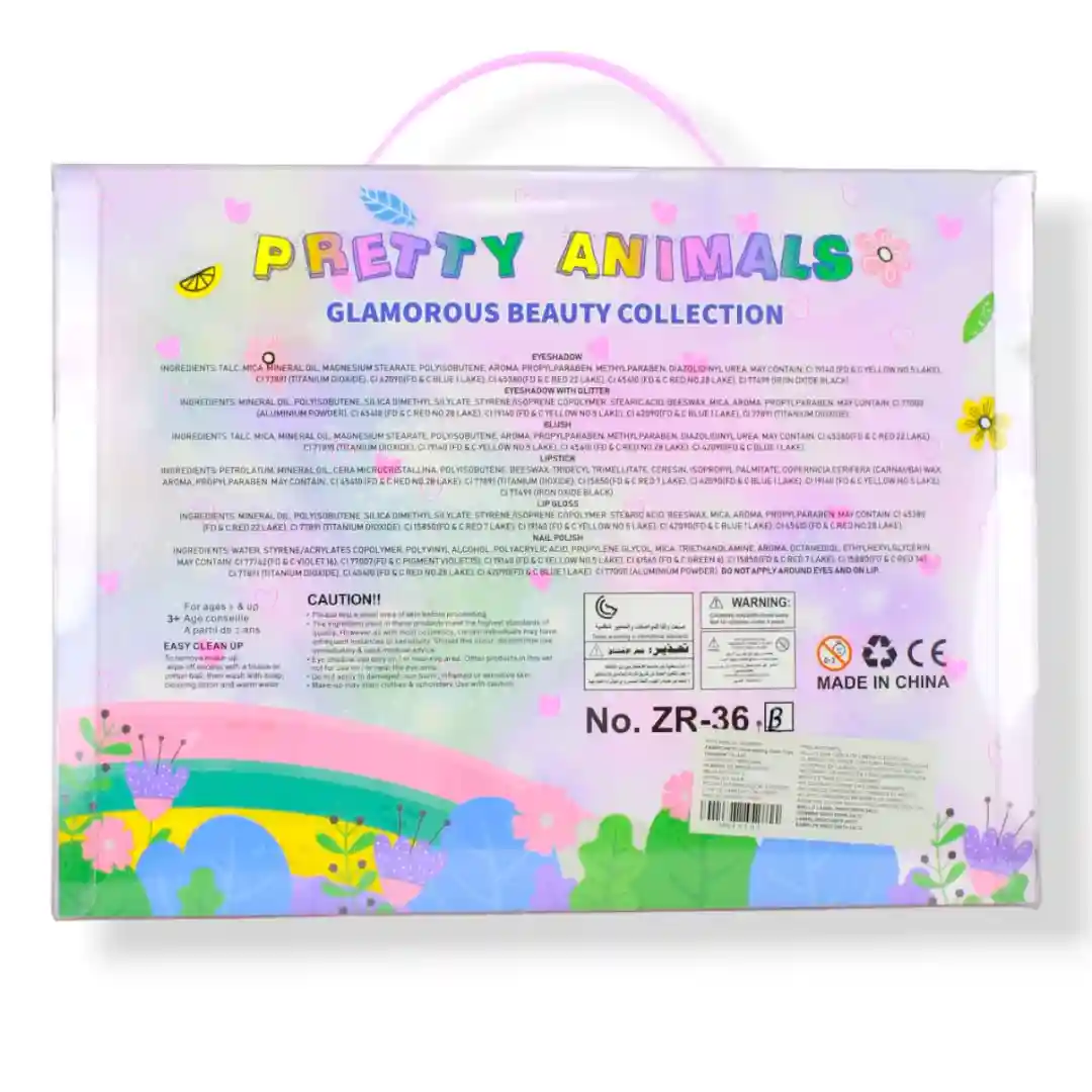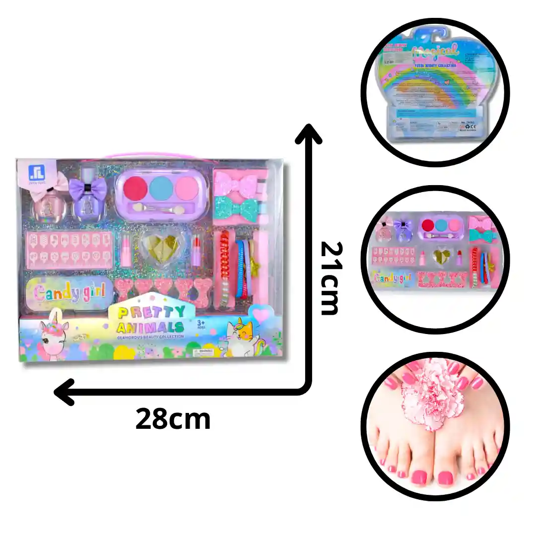 El «Pretty Animals Glamorous Beauty Collection» es un set completo de maquillaje y accesorios de fantasía para niñas. Su presentación en un maletín de cartón lo hace ideal para regalo, mientras que su temática de unicornios y colores pastel es irresistible para el mercado infantil. Este set es perfecto para el juego creativo, ofreciendo una variedad de productos para maquillaje y manicura de juguete.