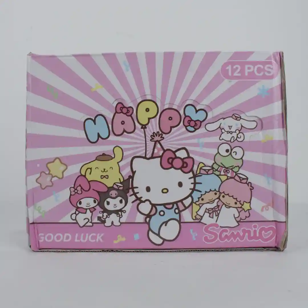 Set de 12 unidades de slime coleccionable en tarros individuales, con figuras de los populares personajes de Sanrio (incluyendo a Hello Kitty, Kuromi, Pompompurin, My Melody, Cinnamoroll, Keroppi, Little Twin Stars, entre otros). Cada tarro contiene slime de colores vibrantes o transparente con glitter, ofreciendo una experiencia de juego sensorial y coleccionable.