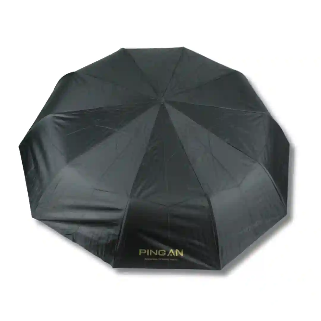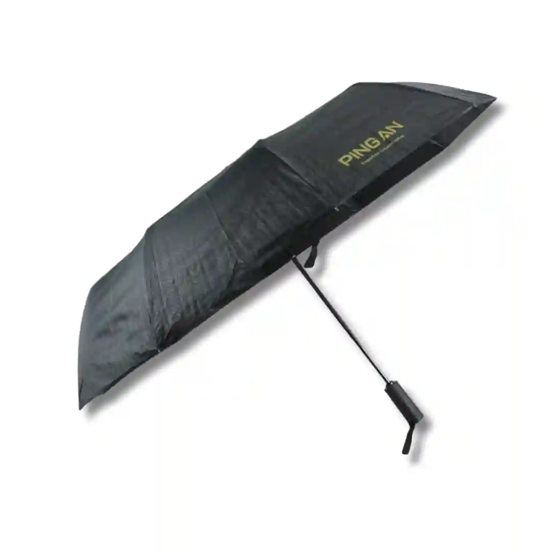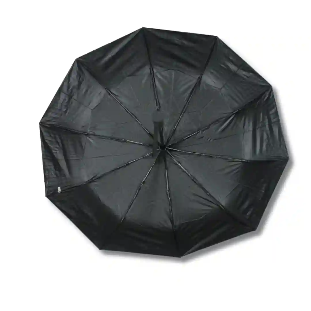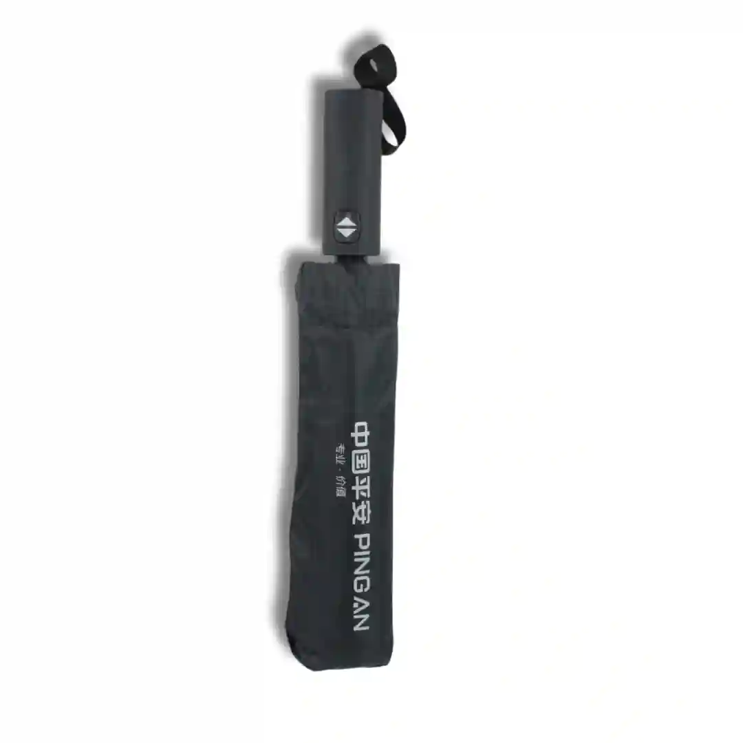 Sombrilla plegable de alta calidad diseñada para ofrecer protección y estilo en cualquier clima. Este modelo destaca por su acabado elegante en color negro con detalles gráficos sutiles en el tejido y un diseño corporativo distintivo. Su sistema de apertura y cierre automático proporciona comodidad y rapidez de uso, convirtiéndola en un accesorio indispensable para el día a día.