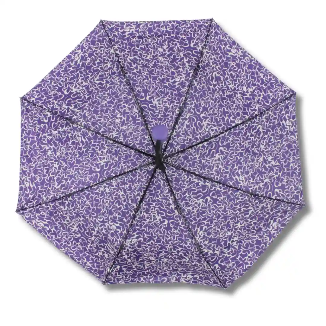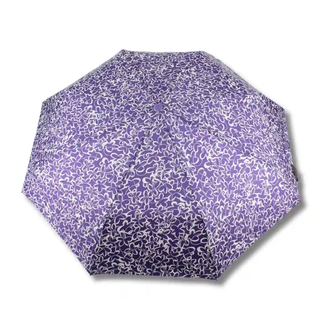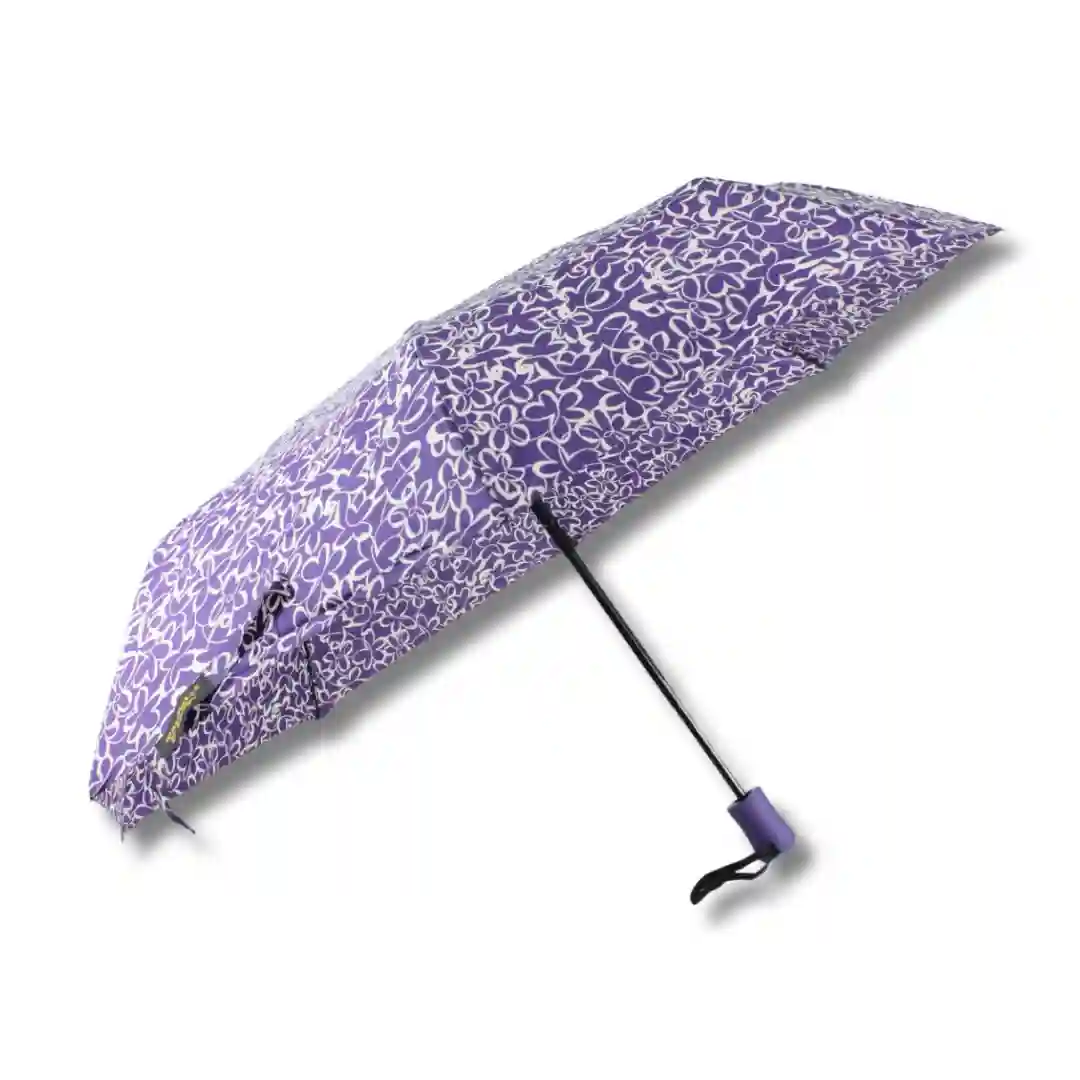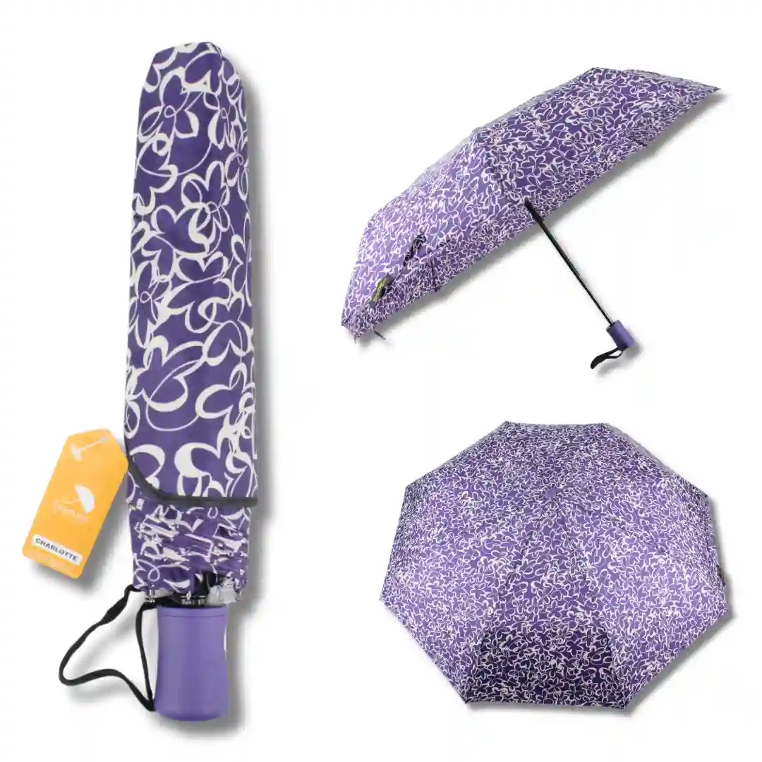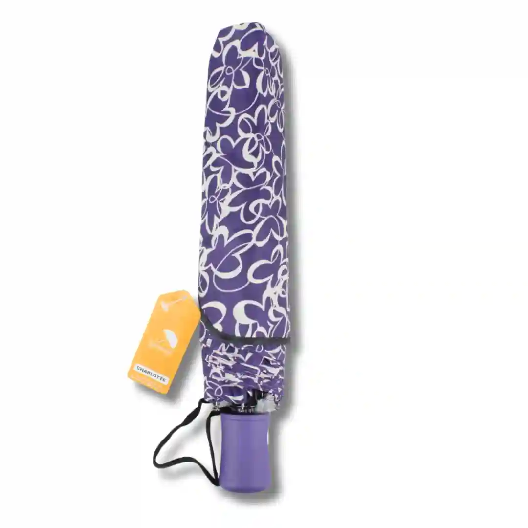 Sombrilla plegable de diseño exclusivo con estampado floral integral, ideal para quienes buscan un accesorio funcional y con estilo. Este modelo combina un vibrante color morado con motivos botánicos en blanco, ofreciendo una estética moderna y sofisticada para la protección contra la lluvia o el sol.