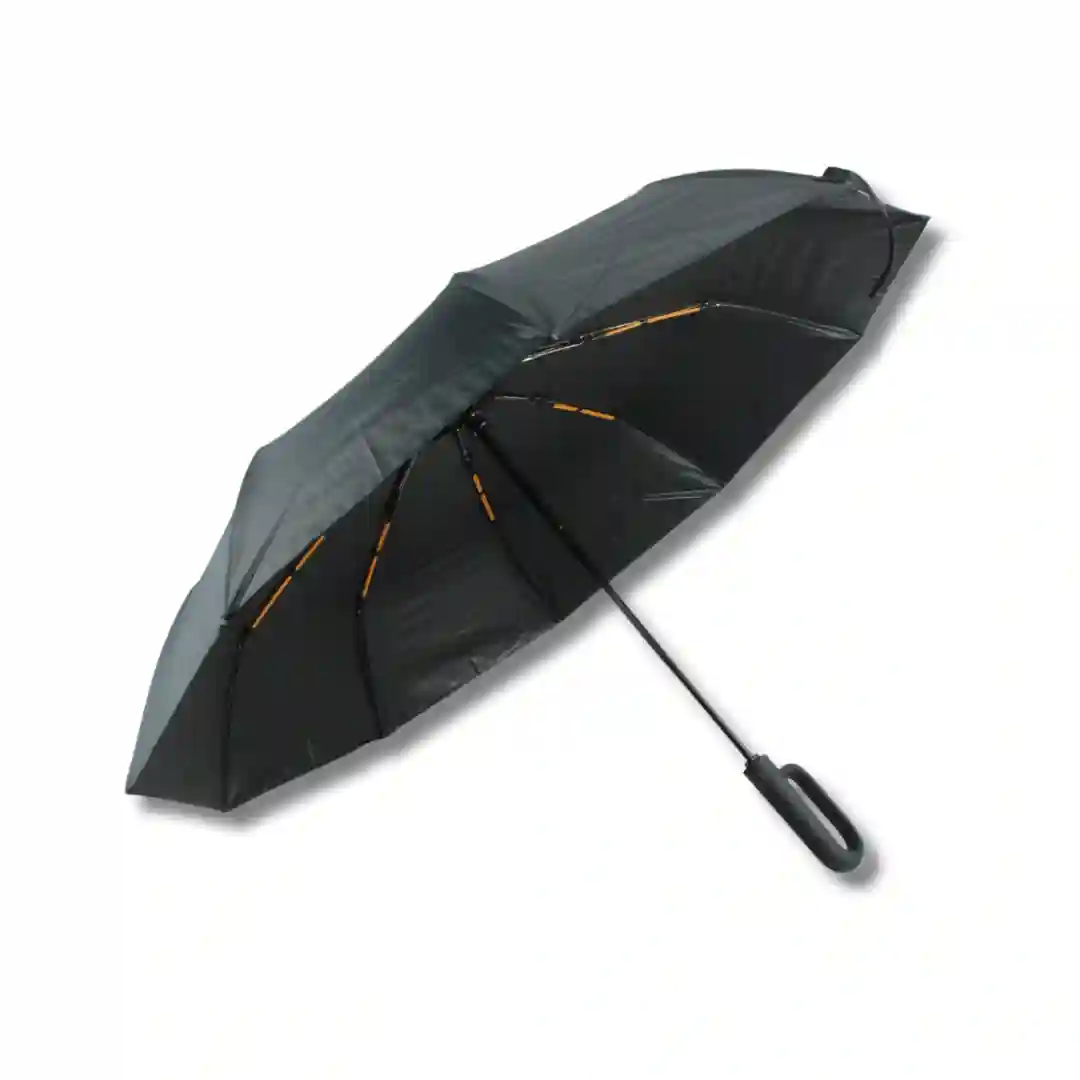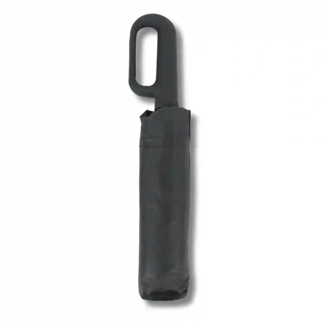 Sombrilla plegable de alta resistencia con diseño ergonómico y vanguardista. Este modelo destaca por su mango innovador tipo mosquetón que permite un agarre seguro o su sujeción práctica a bolsos y mochilas. Su estructura reforzada y su acabado monocromático la convierten en un accesorio indispensable y sofisticado para la protección contra la lluvia y el sol.