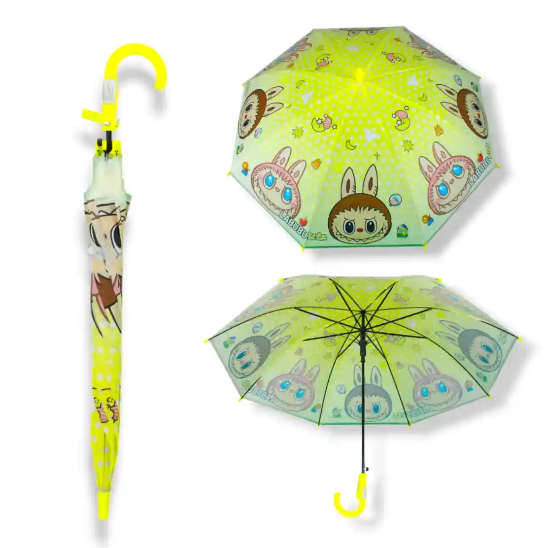 El modelo amarillo verdoso: ¡Una explosión de color y diversión! Está llena de simpáticos conejitos y pequeños monstruos que seguro harán sonreír a tus niños en esos días grises. Su diseño alegre con lunares y estos personajes harán que ir al colegio o salir a pasear bajo la lluvia sea una aventura emocionante.