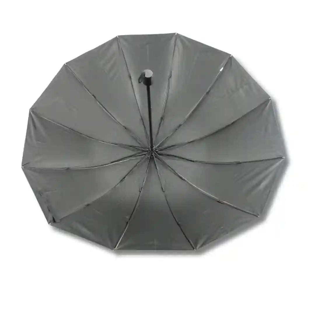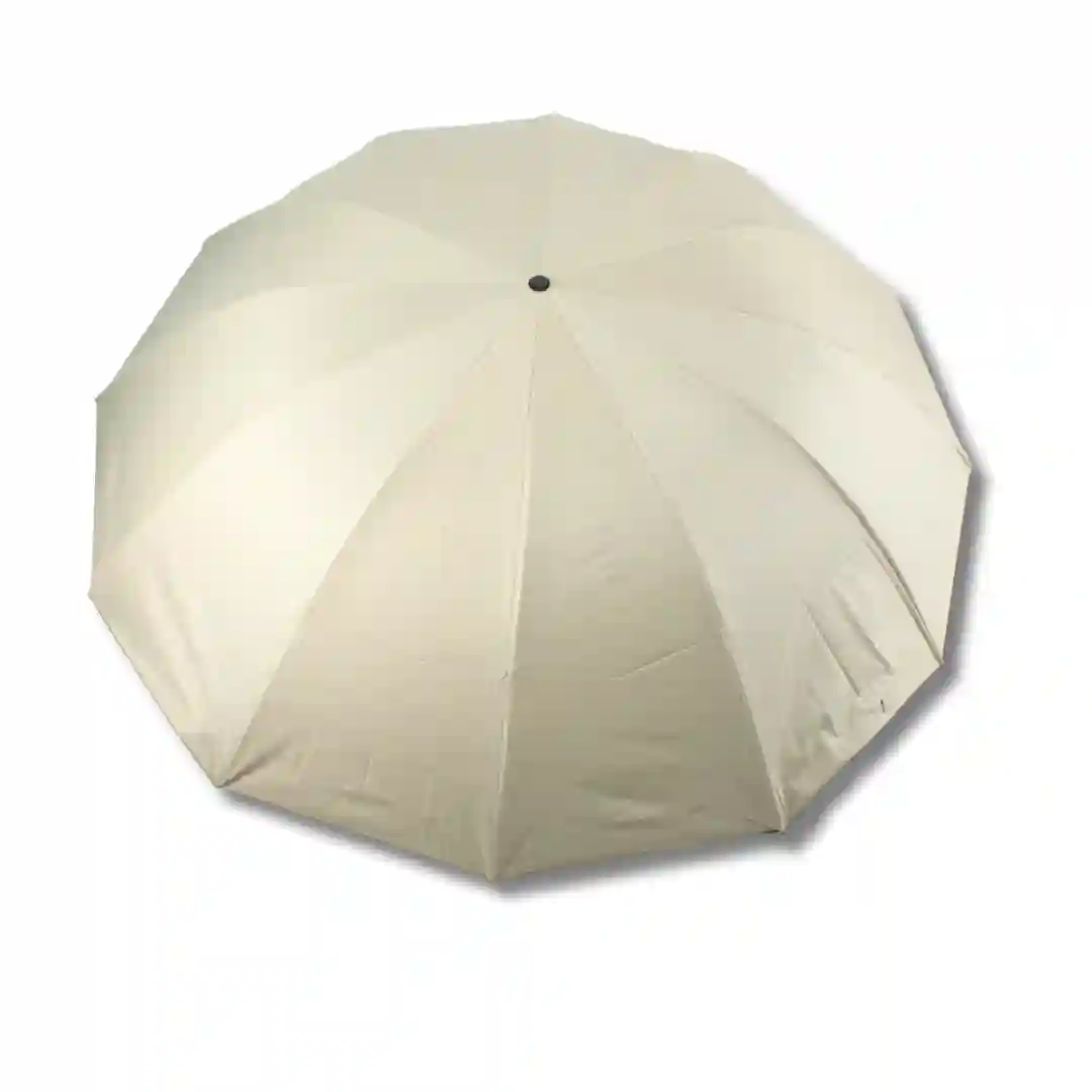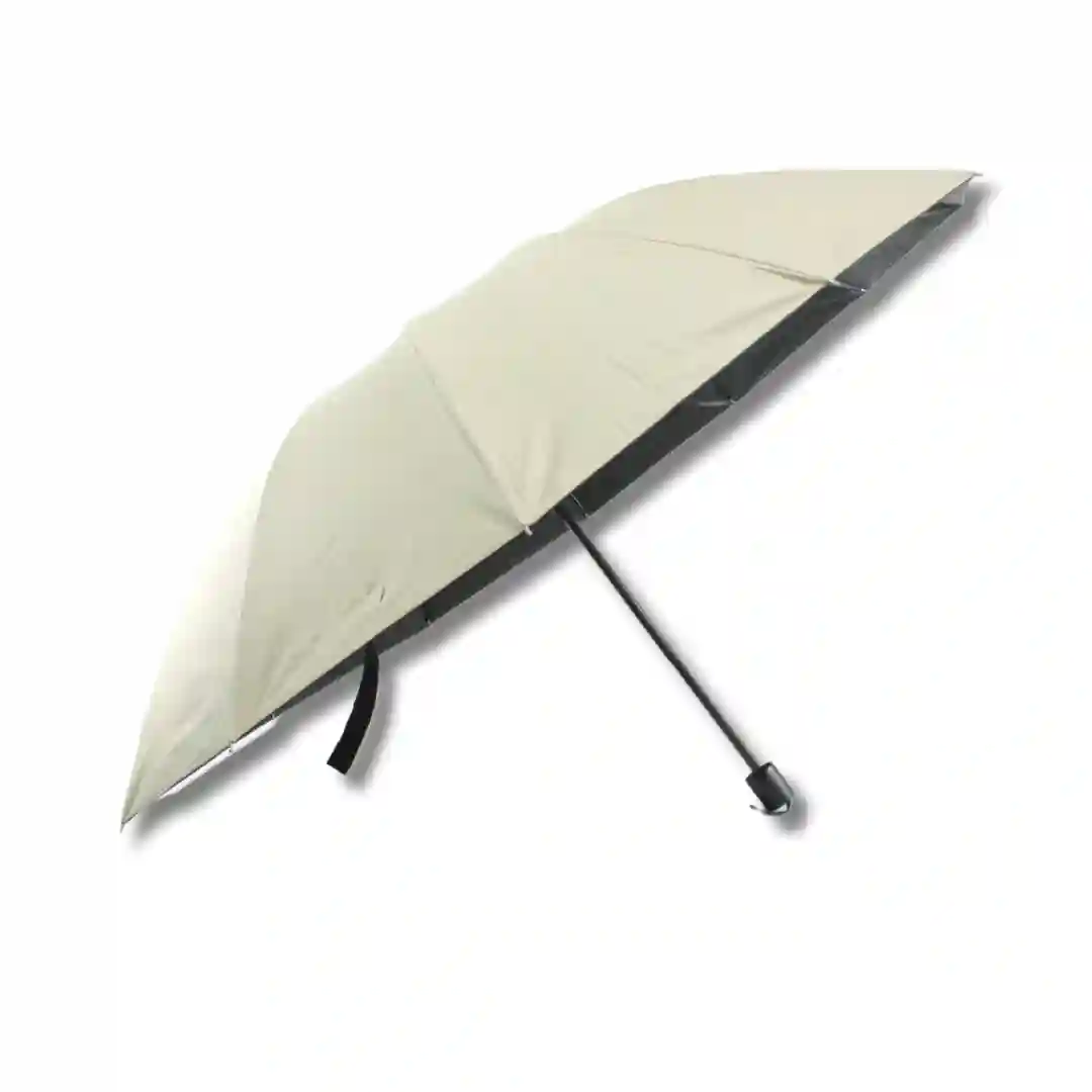 Sombrilla plegable de diseño elegante y funcional, ideal para protección contra el clima con un estilo minimalista. Su estructura resistente y compacta permite un almacenamiento práctico y un transporte sencillo, siendo el accesorio perfecto para el uso diario. Presenta un acabado exterior en tono crema/beige con un recubrimiento interno oscuro especializado para optimizar la sombra y la protección.