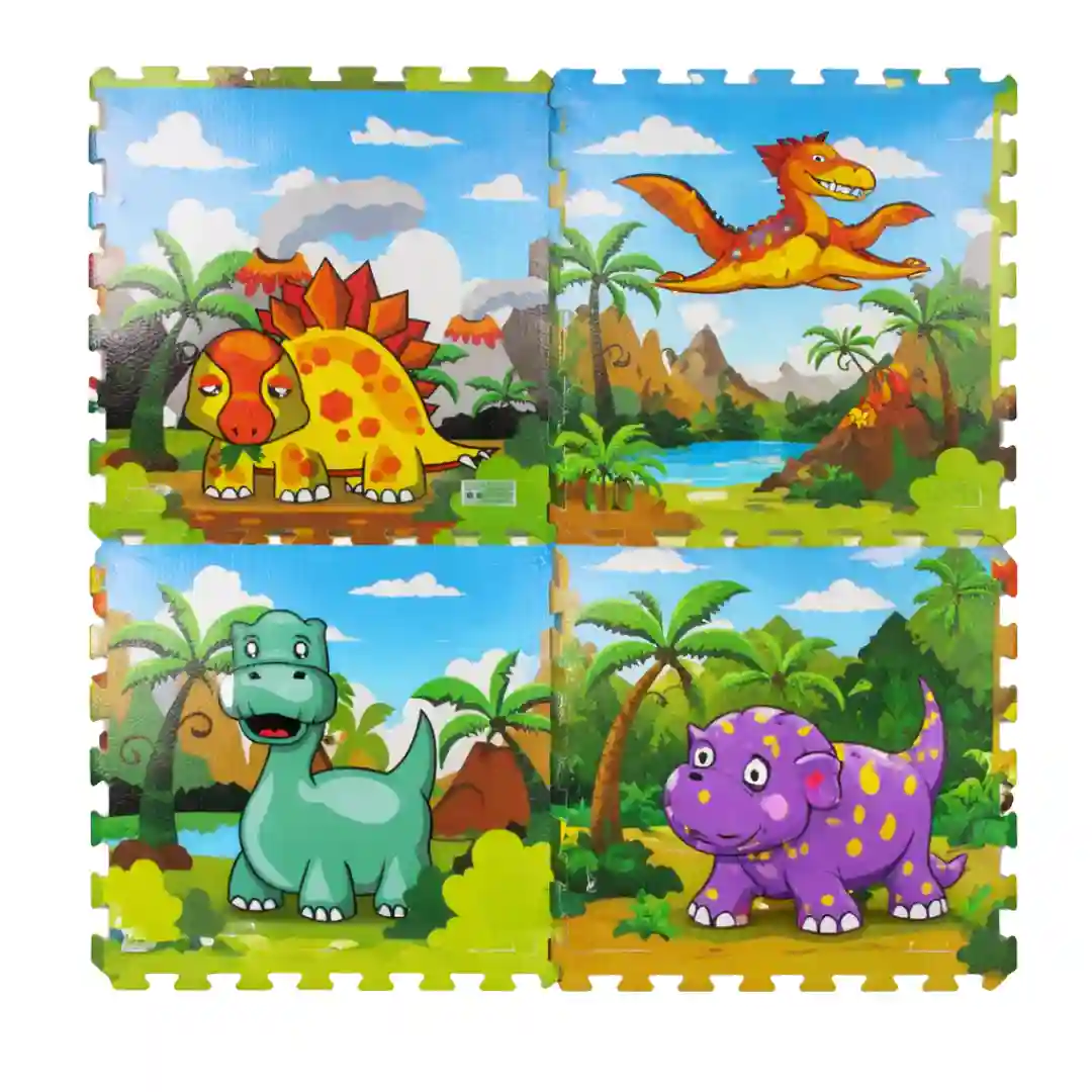 Este tapete tipo rompecabezas de foamy está diseñado para crear un área de juego segura, cómoda y estimulante para los más pequeños. Presenta ilustraciones vibrantes de dinosaurios en paisajes prehistóricos con volcanes, palmeras y cielos despejados, ideales para fomentar la imaginación y el aprendizaje visual durante el desarrollo infantil.