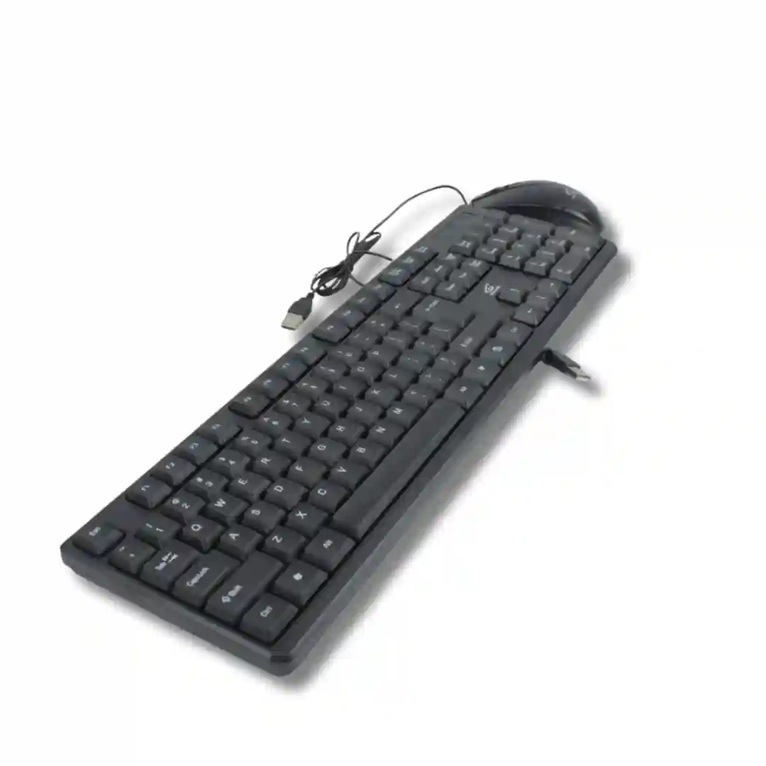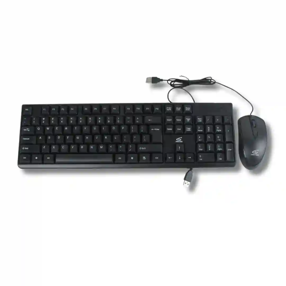 Combo de teclado y mouse diseñado para una experiencia de uso eficiente y fluida en computadoras. El conjunto presenta un diseño ergonómico y compacto en color negro, ideal para optimizar el espacio de trabajo.