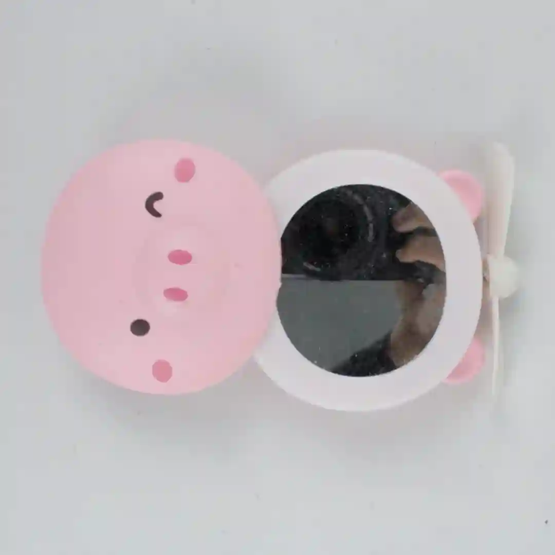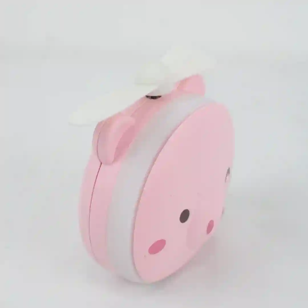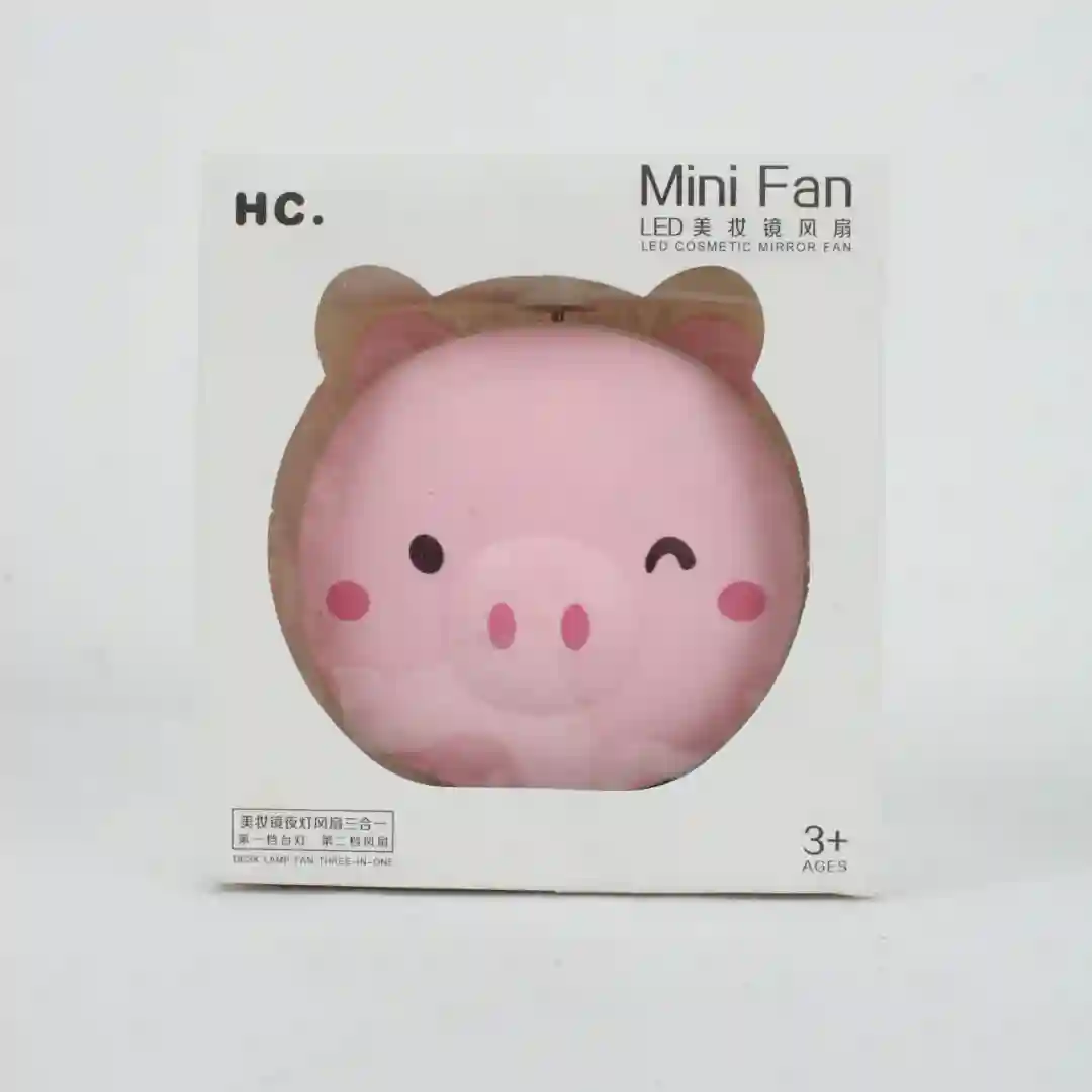 Mini ventilador portátil con diseño de cerdito, ideal para el cuidado personal y retoques de maquillaje. Este dispositivo tres en uno combina la funcionalidad de un ventilador de mano, un espejo cosmético integrado y una luz LED perimetral, ofreciendo una solución práctica y compacta para el uso diario. Su estructura plegable permite proteger el espejo mientras no está en uso y facilita su transporte.
