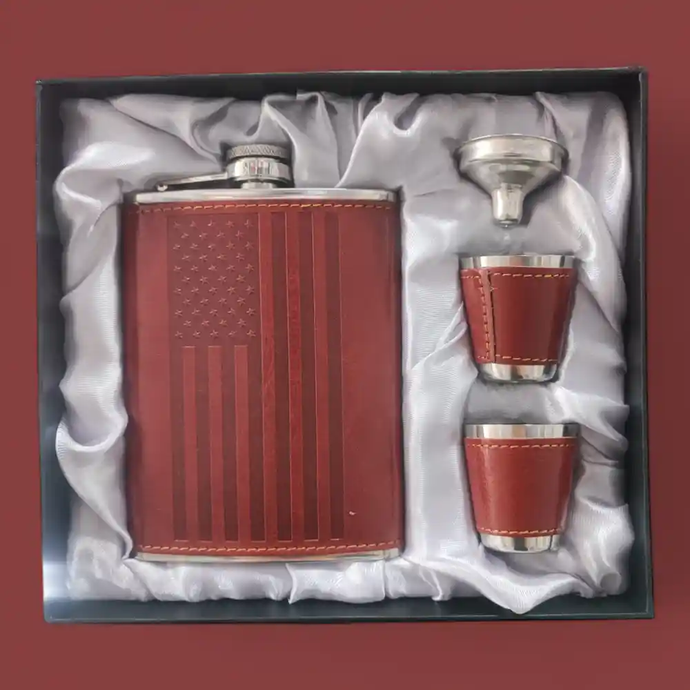 - Wiskera de acero inoxidable con forro de cuero y diseño patriótico: La wiskera principal está fabricada en acero inoxidable de alta calidad, garantizando durabilidad y la conservación del sabor de las bebidas. Lo que distingue a esta wiskera es su forro de cuero (aparentemente de color marrón rojizo) con un diseño grabado de la bandera de Estados Unidos. Este detalle le confiere un toque distintivo y patriótico.